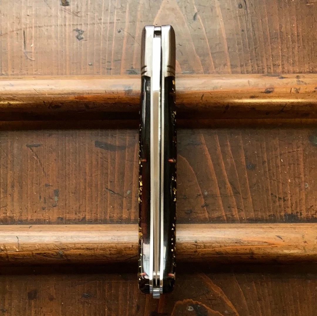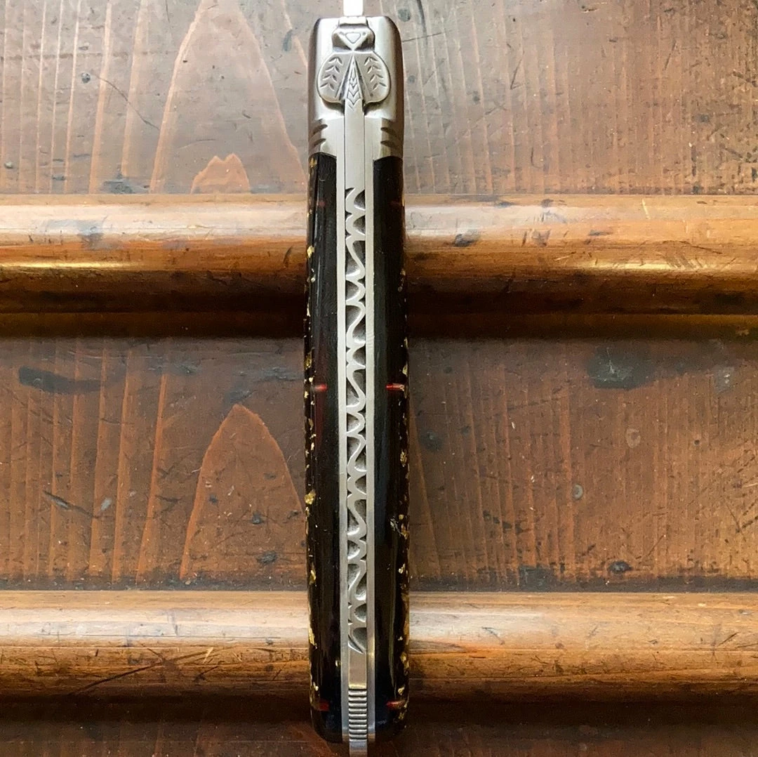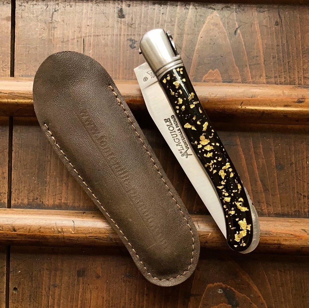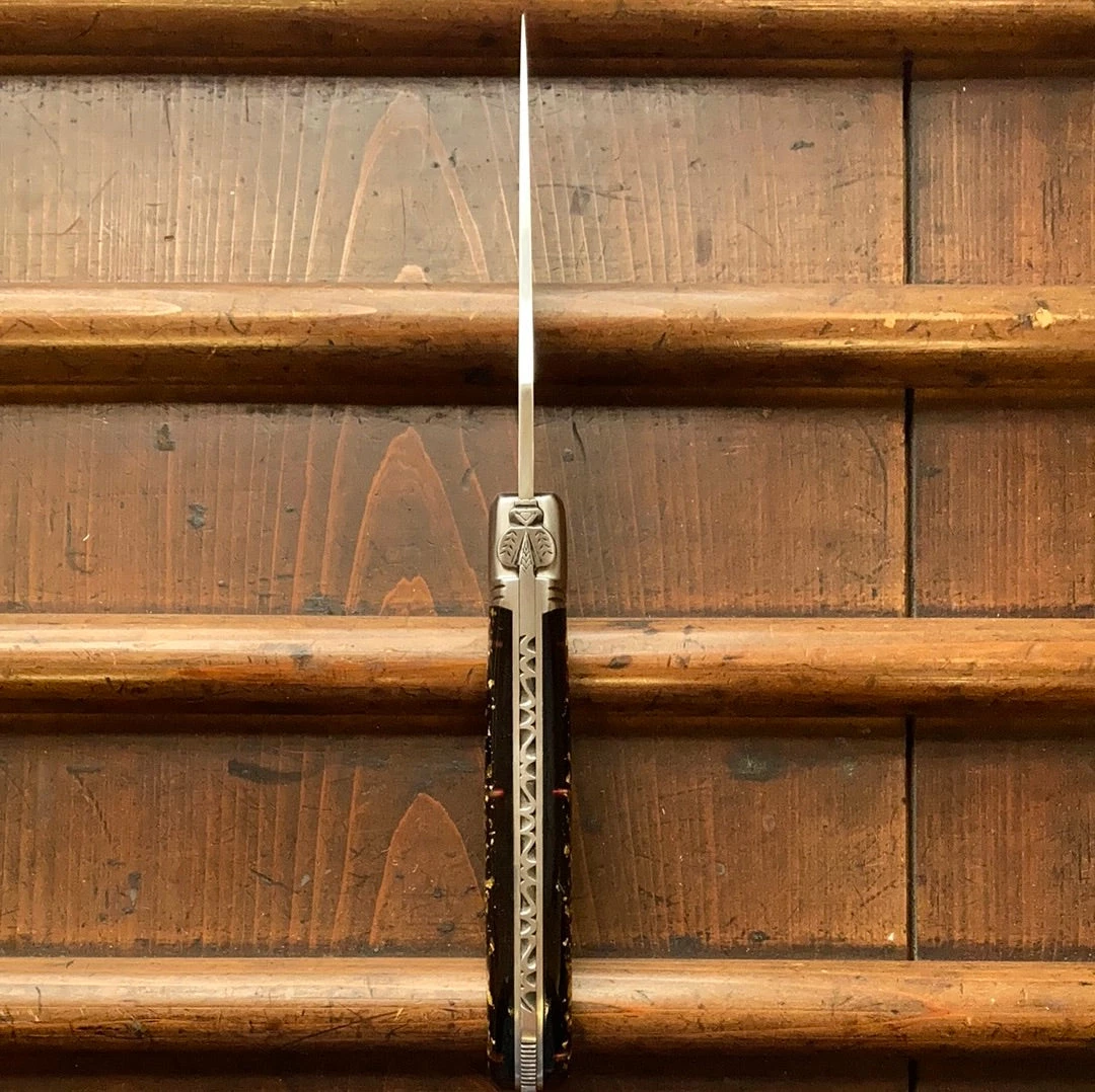 The Laguiole knife has a distinctive design influenced by the Spanish Navaja. A smaller, more tactile version was made for the sheep-herders on the Aubrac plateau in France, and was named after the town Laguiole. In addition to the iconic โbeeโ or โflyโ on the spring, typically they feature a semi yataghan shaped blade, a slip joint mechanism with a slim tapered handle made from natural material, traditionally cow horn.