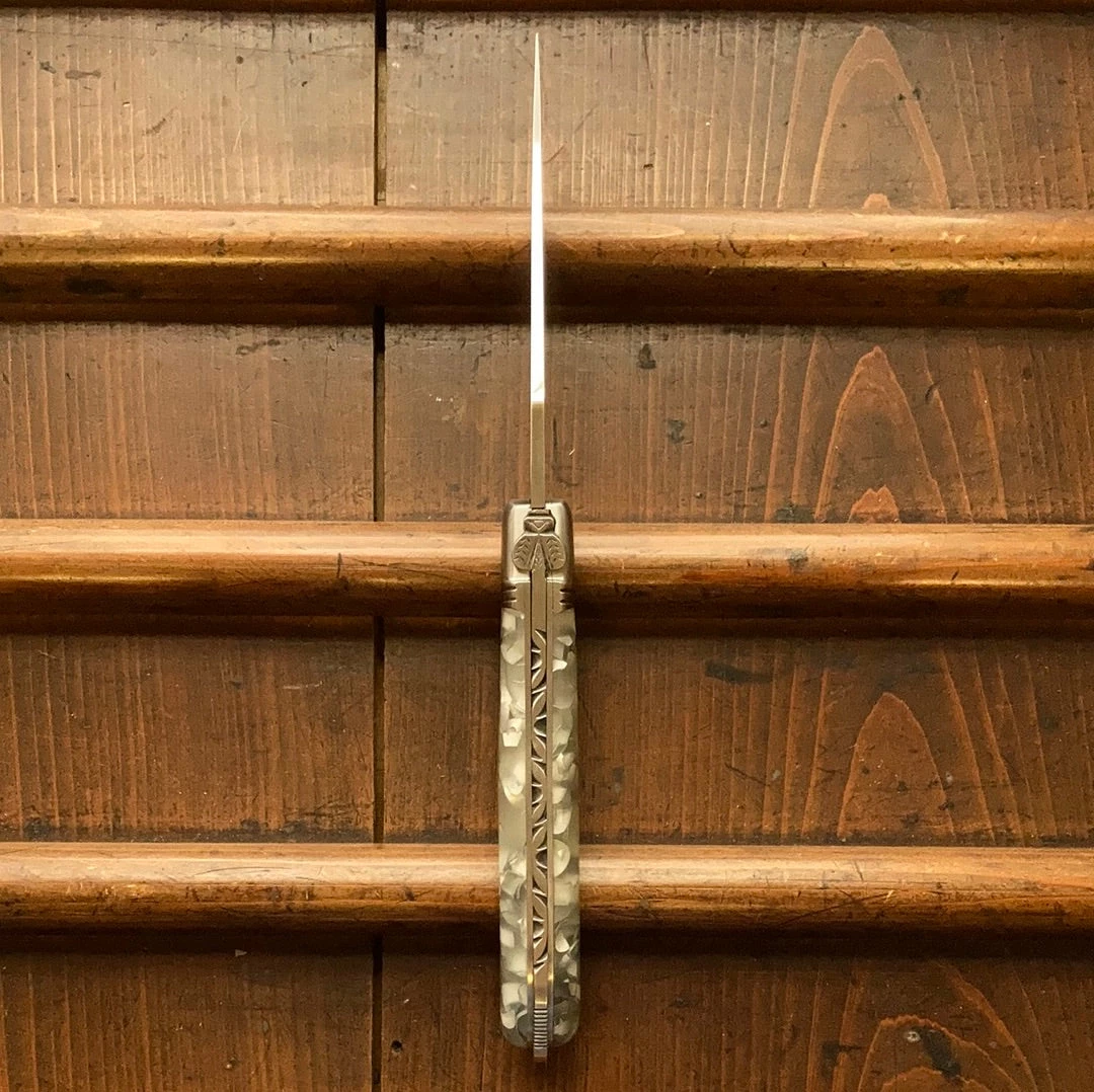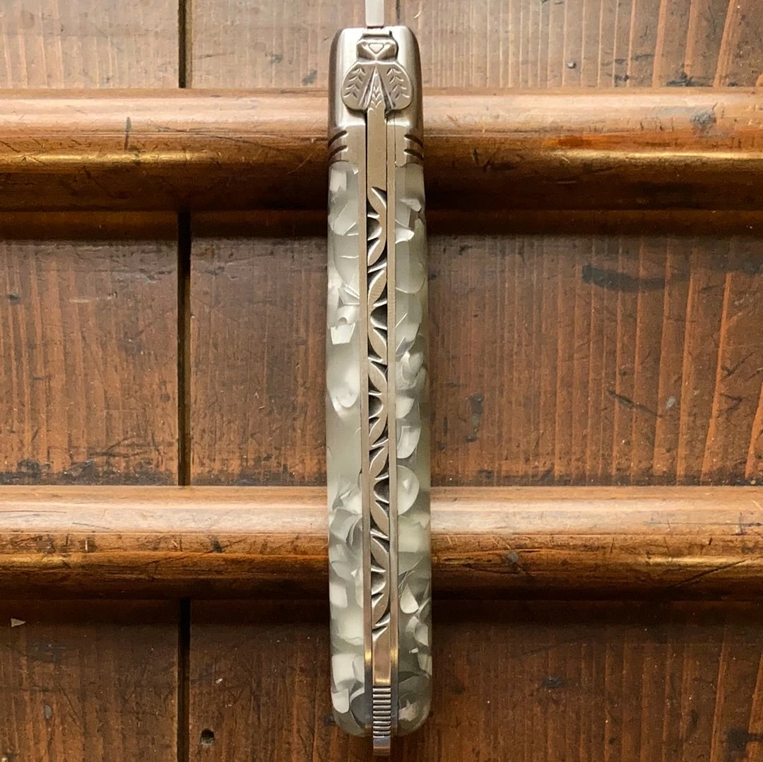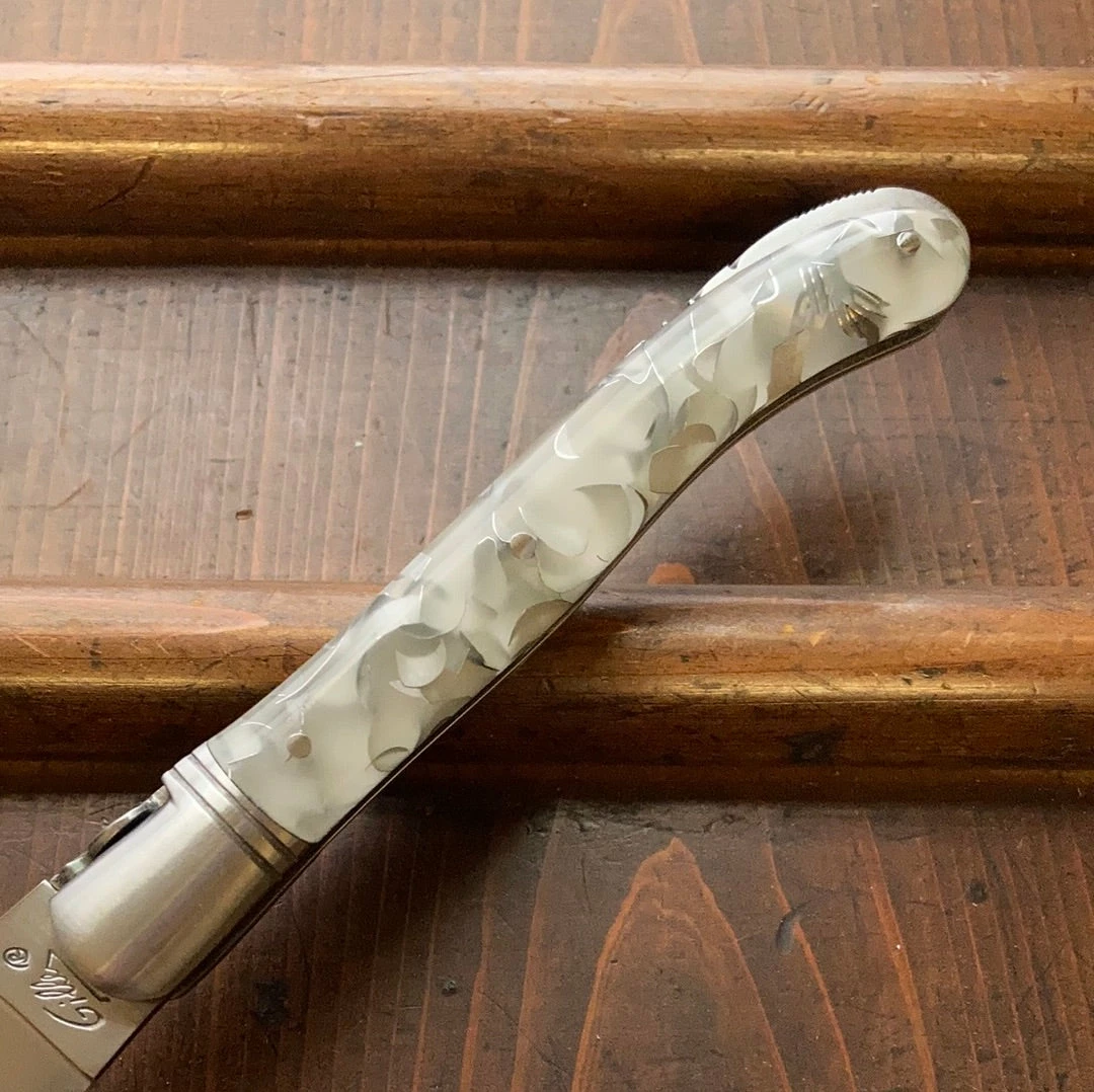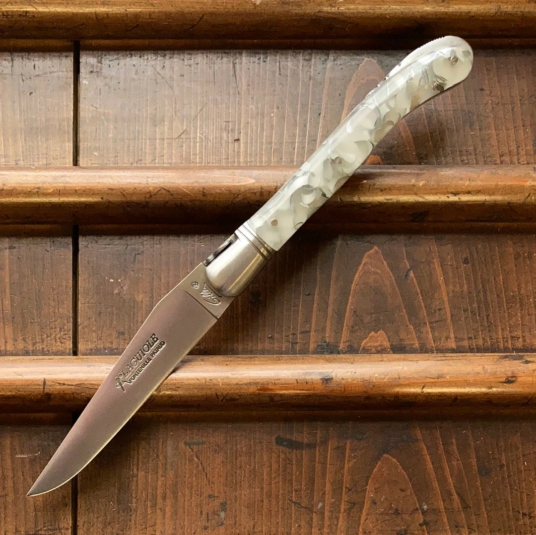The Laguiole knife has a distinctive design influenced by the Spanish Navaja. A smaller, more tactile version was made for the sheep-herders on the Aubrac plateau in France, and was named after the town Laguiole. In addition to the iconic โbeeโ or โflyโ on the spring, typically they feature a semi yataghan shaped blade, a slip joint mechanism with a slim tapered handle made from natural material, traditionally cow horn.