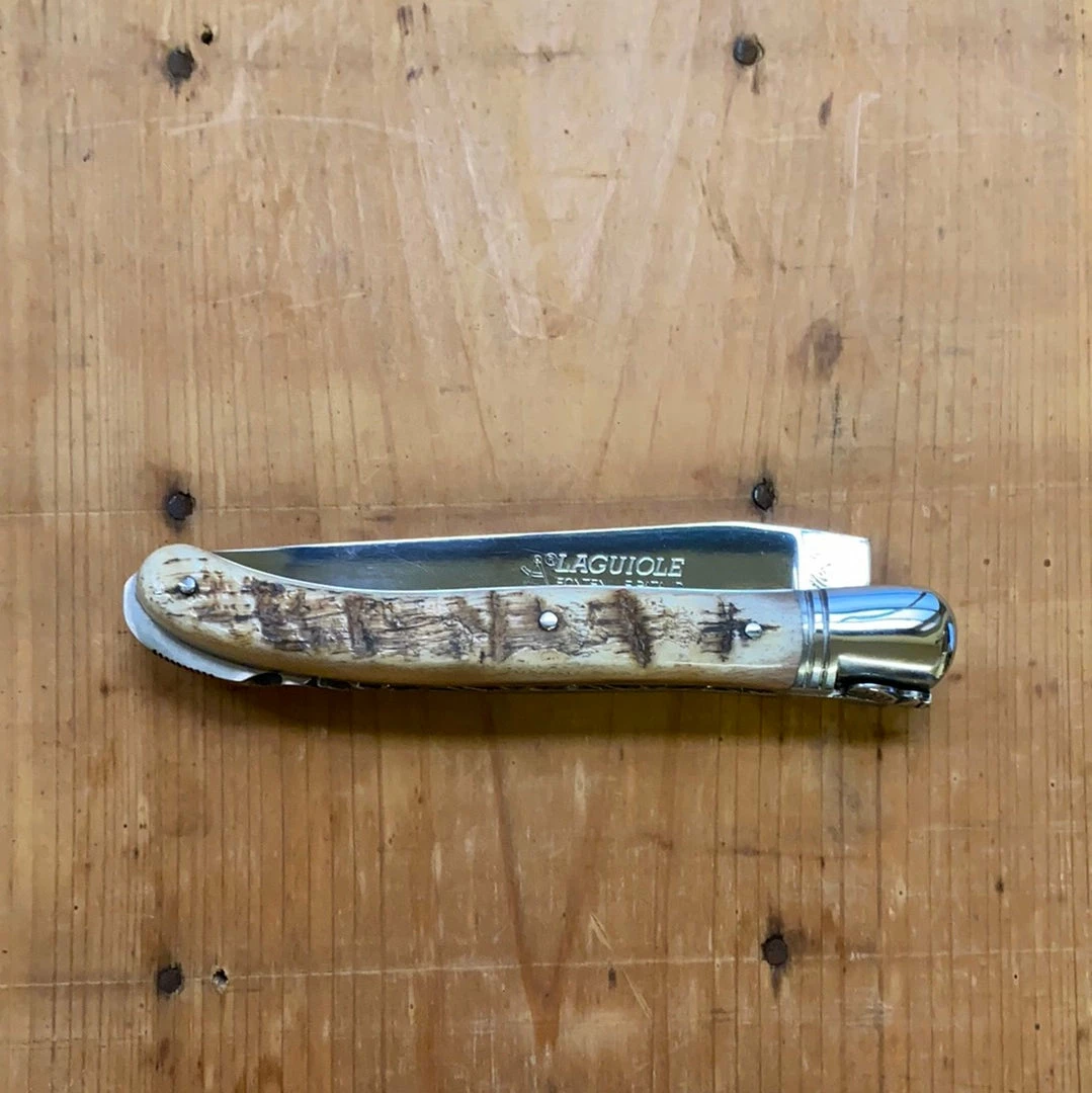 The Laguiole knife has a distinctive design influenced by the Spanish Navaja. A smaller, more tactile version was made for the sheep-herders on the Aubrac plateau in France, and was named after the town Laguiole. In addition to the iconic โbeeโ or โflyโ on the spring, typically they feature a semi yataghan shaped blade, a slip joint mechanism with a slim tapered handle made from natural material, traditionally cow horn.