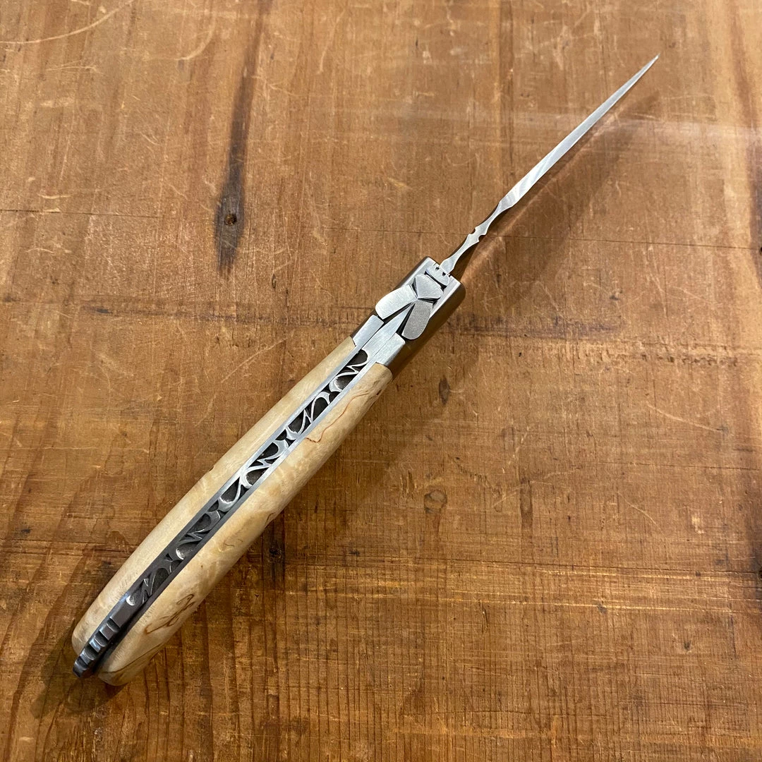 The Laguiole knife has a distinctive design influenced by the Spanish Navaja. A smaller, more tactile version was made for the sheep-herders on the Aubrac plateau in France, and was named after the town Laguiole. In addition to the iconic ‘bee’ or ‘fly’ on the spring, typically they feature a semi yataghan shaped blade, a slip joint mechanism with a slim tapered handle made from natural material, traditionally cow horn.