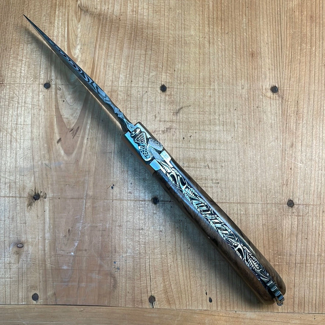 The Laguiole knife has a distinctive design influenced by the Spanish Navaja. A smaller, more tactile version was made for the sheep-herders on the Aubrac plateau in France, and was named after the town Laguiole. In addition to the iconic โbeeโ or โflyโ on the spring, typically they feature a semi yataghan shaped blade, a slip joint mechanism with a slim tapered handle made from natural material, traditionally cow horn.