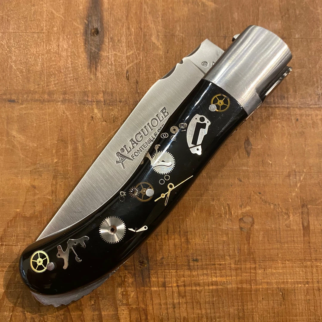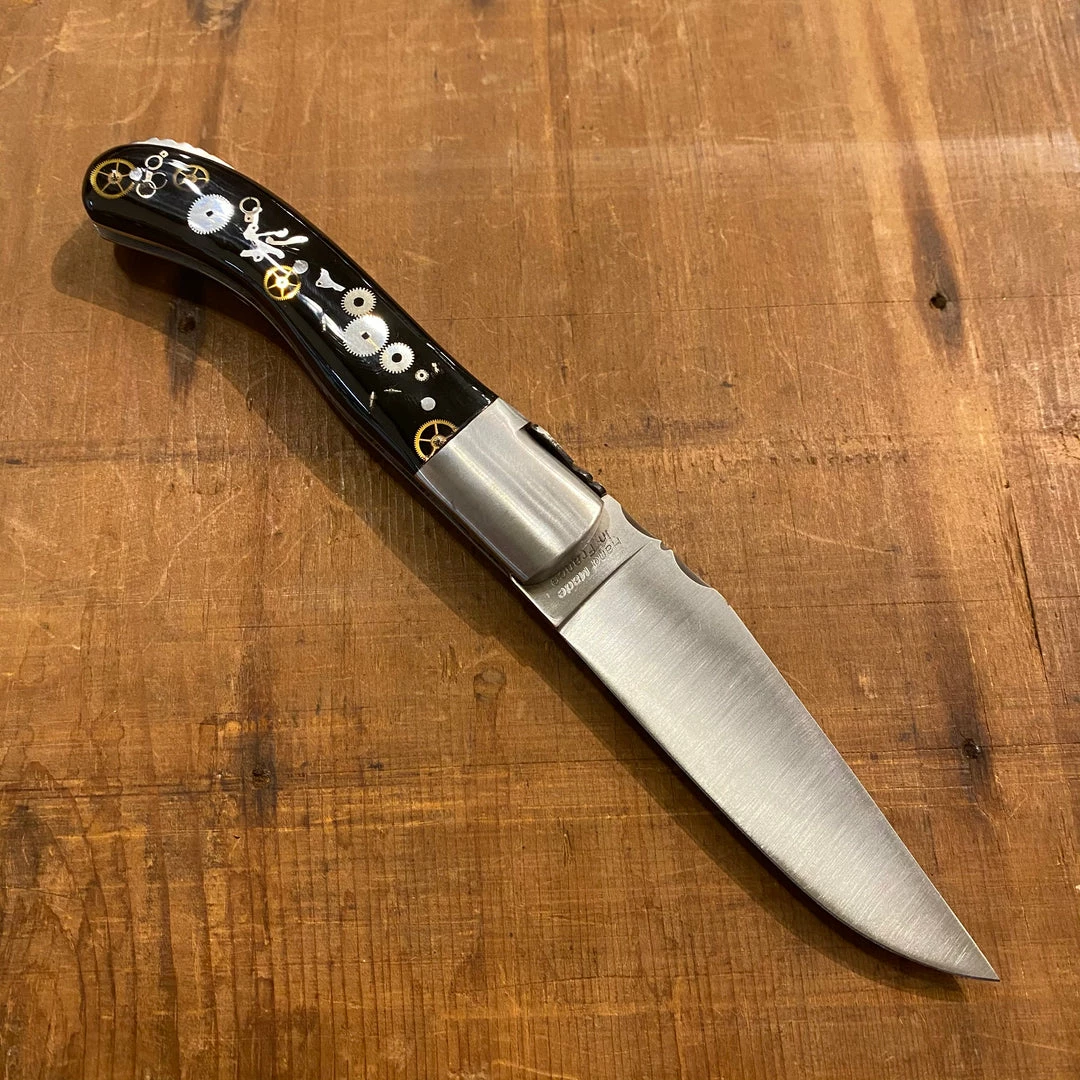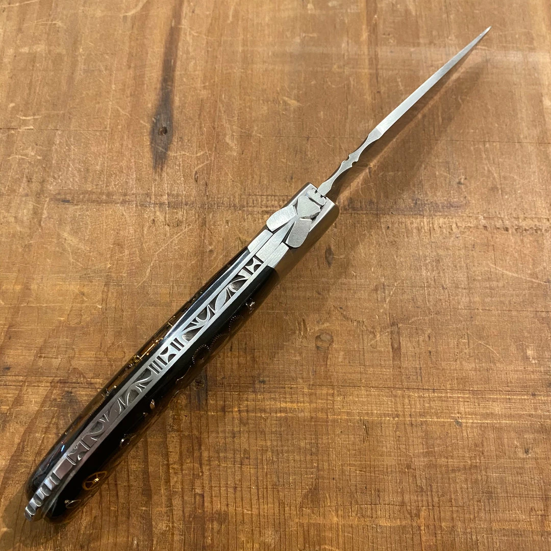 The Laguiole knife has a distinctive design influenced by the Spanish Navaja. A smaller, more tactile version was made for the sheep-herders on the Aubrac plateau in France, and was named after the town Laguiole. In addition to the iconic โbeeโ or โflyโ on the spring, typically they feature a semi yataghan shaped blade, a slip joint mechanism with a slim tapered handle made from natural material, traditionally cow horn.