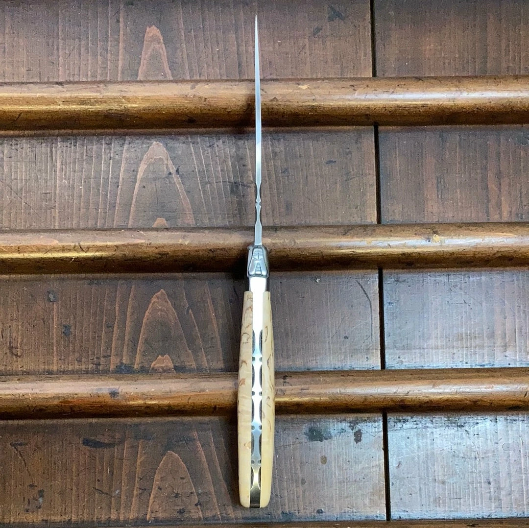 The Laguiole knife has a distinctive design influenced by the Spanish Navaja. A smaller, more tactile version was made for the sheep-herders on the Aubrac plateau in France, and was named after the town Laguiole. In addition to the iconic ‘bee’ or ‘fly’ on the spring, typically they feature a semi yataghan shaped blade, a slip joint mechanism with a slim tapered handle made from natural material, traditionally cow horn.