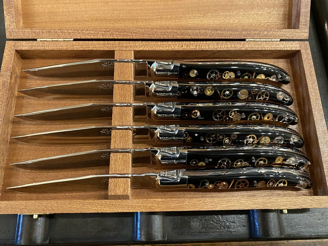 Fontenille Pataud Laguiole table knife set made in Thiers France with the high level of quality craftsmanship and finish that Fontenille Pataud is known for. Handles on these are made with watch mechanisms cast into durable crystallium.