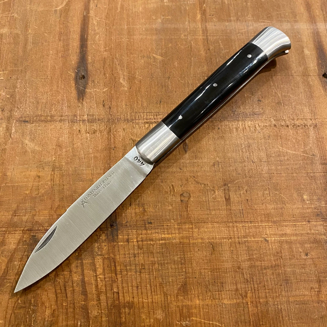 Hand made in France by Fontenille Pataud stainless blade, double stainless bolsters and hand filed spring, handle is hafted in water buffalo horn.