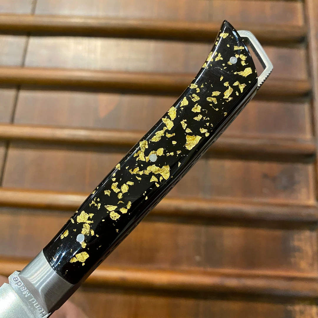 Hand made in France by Fontenille Pataud featuring a stainless blade, stainless bolster and hand filed spring.ย Handle is haftedย in cristallium, withย 24 carat gold sheet inlay.