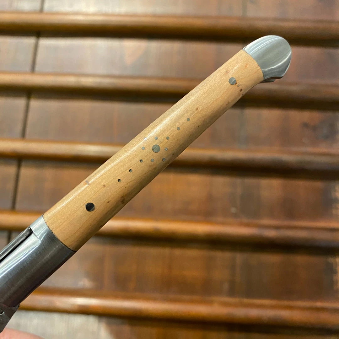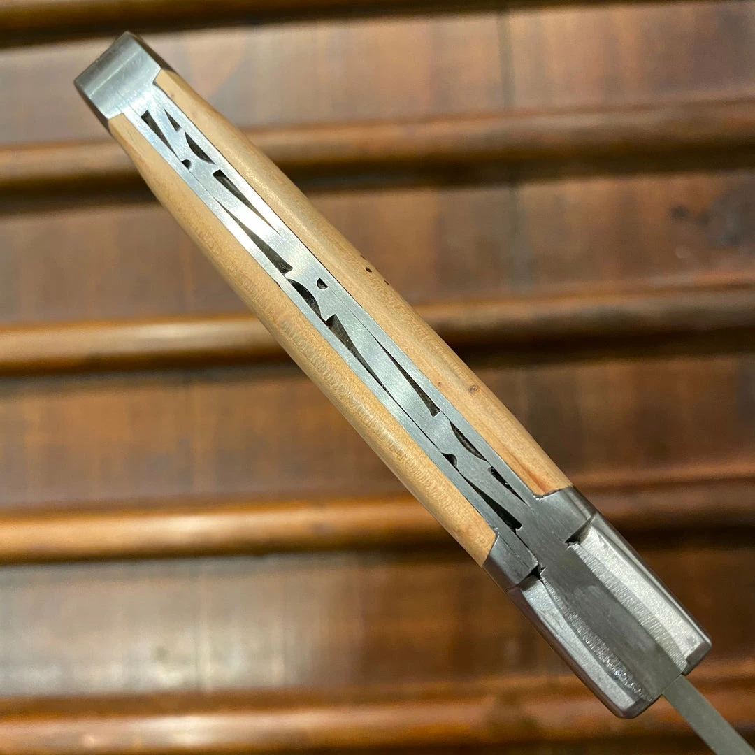 The Saint Martin style pocket knife is sleek and slim. The blade has a flat profile, and the handle is decorated with stainless rivets.