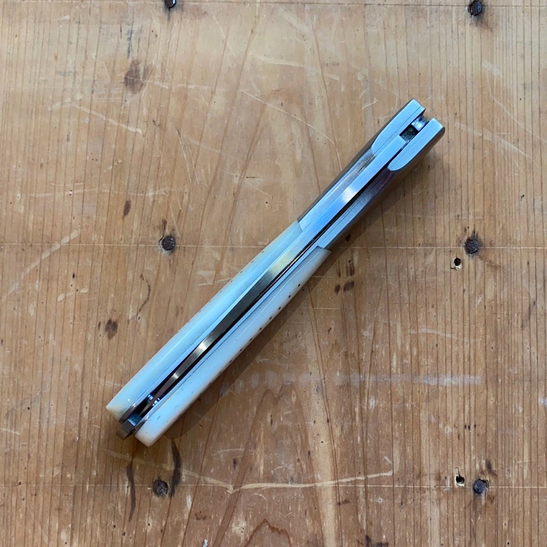 Hand made in France by Fontenille Pataud stainless blade, stainless bolsters and hand filed spring and locking release at the butt of handle which is hafted in hand carved buffalo horn with nickel pin inlay.