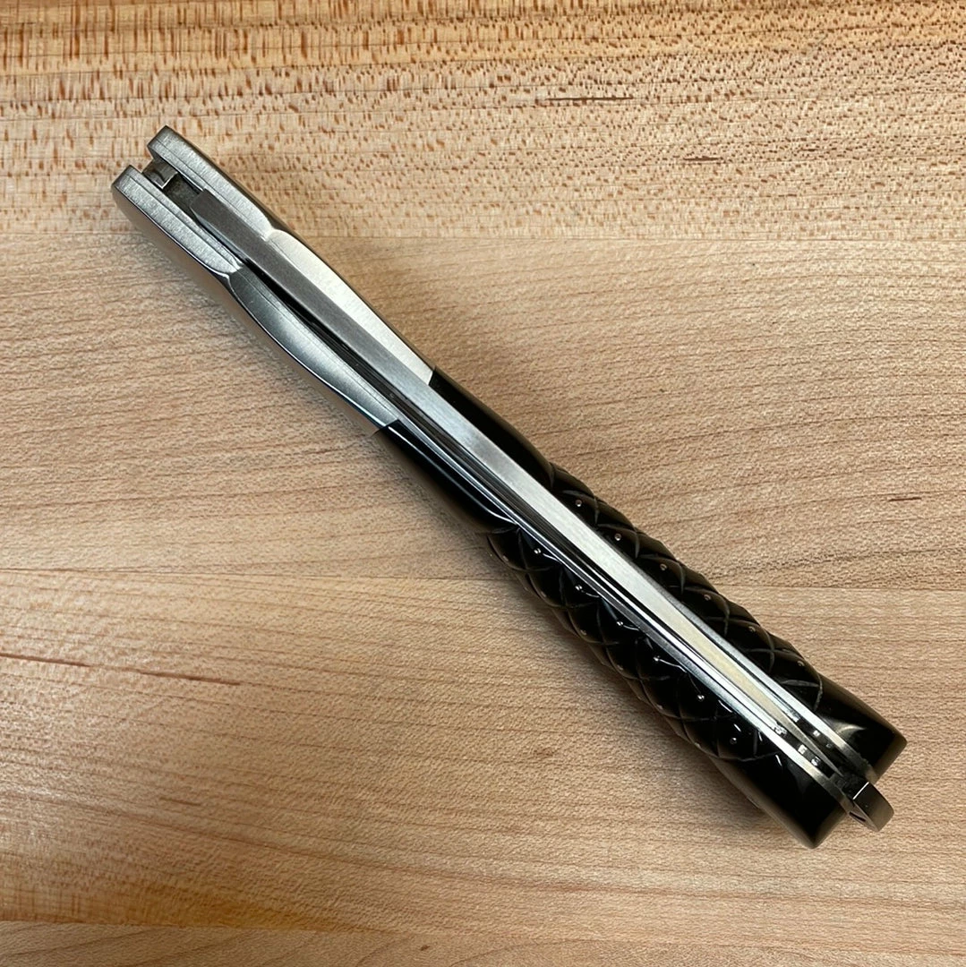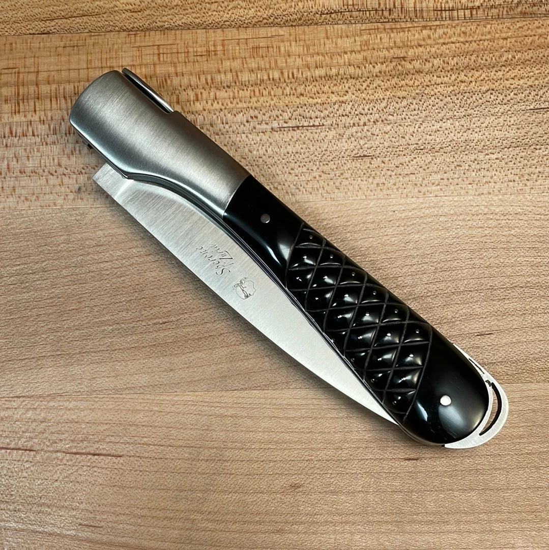 Hand made in France by Fontenille Pataud stainless blade, stainless bolsters and hand filed spring and locking release at the butt of handle which is hafted in hand carved buffalo horn with nickel pin inlay.