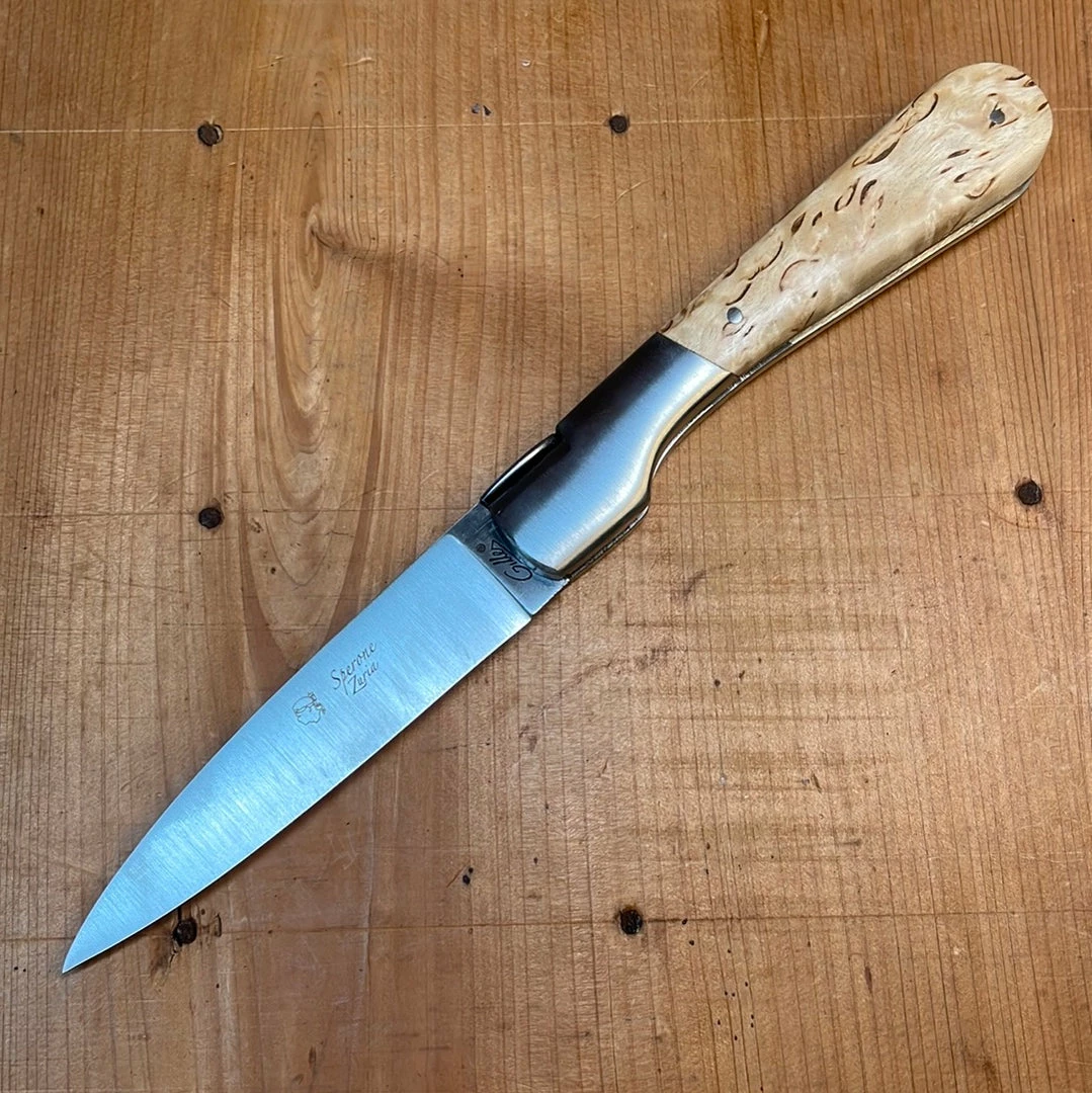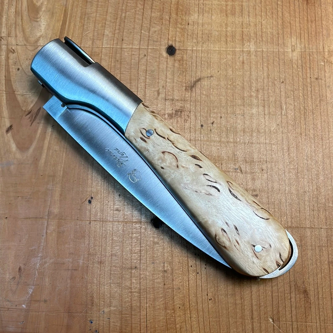 Hand made in France by Fontenille Pataud with a stainless blade, stainless bolsters and corkscrew, and hand filed spring (no lock on this one) at the butt of handle which is hafted in curly birch wood.