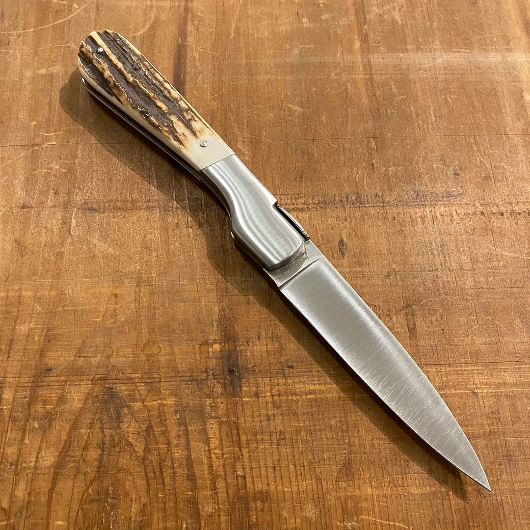 Hand made in France by Fontenille Pataud stainless blade, stainless bolsters and hand filed spring and locking release at the butt of handle which is hafted in stag.
