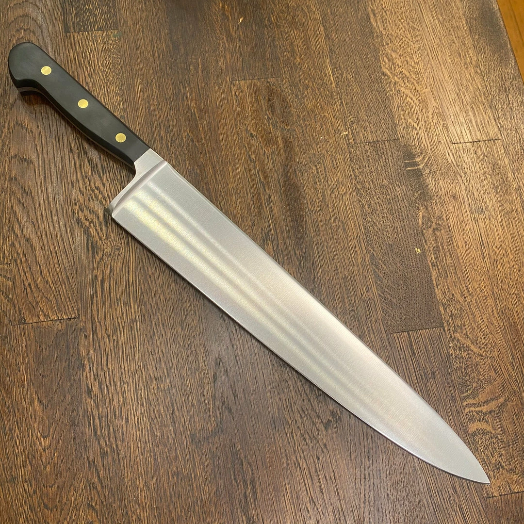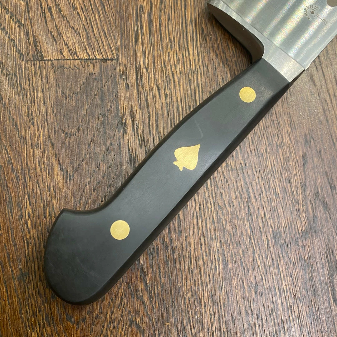 12″ drop forged stainless steel western chef’s knife with black POM riveted handle withe Pikas Spade insignia.