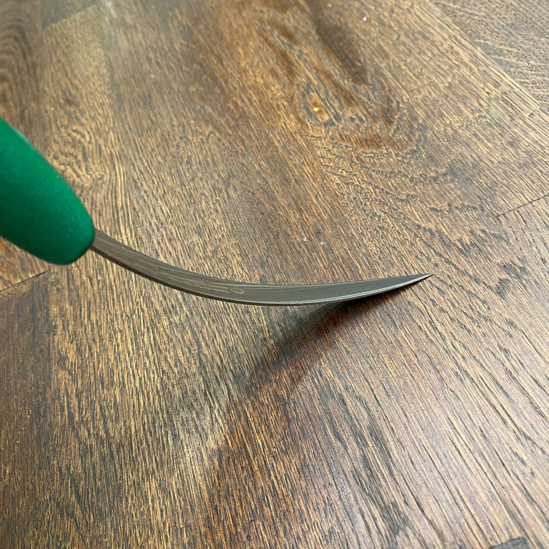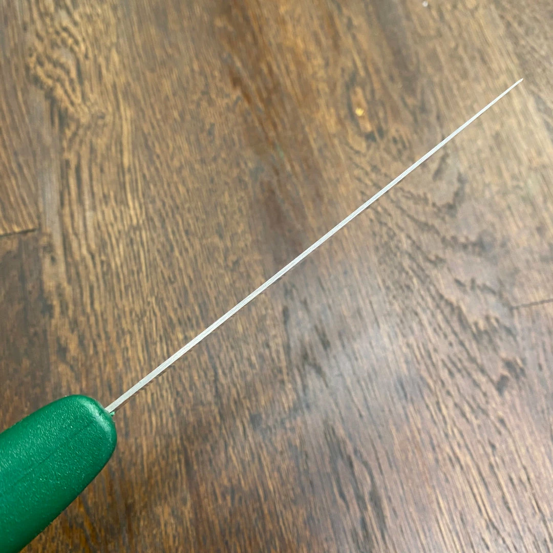5″ stainless steel straight stiff boning knife with green plastic ergonomic handle from the Pikas-Don Carlos line.