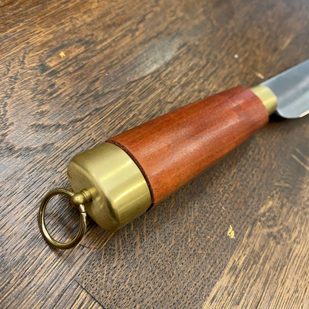 6″ carbon steel utility knife with hidden-tang cherry handle, brass bolster and apron ring.