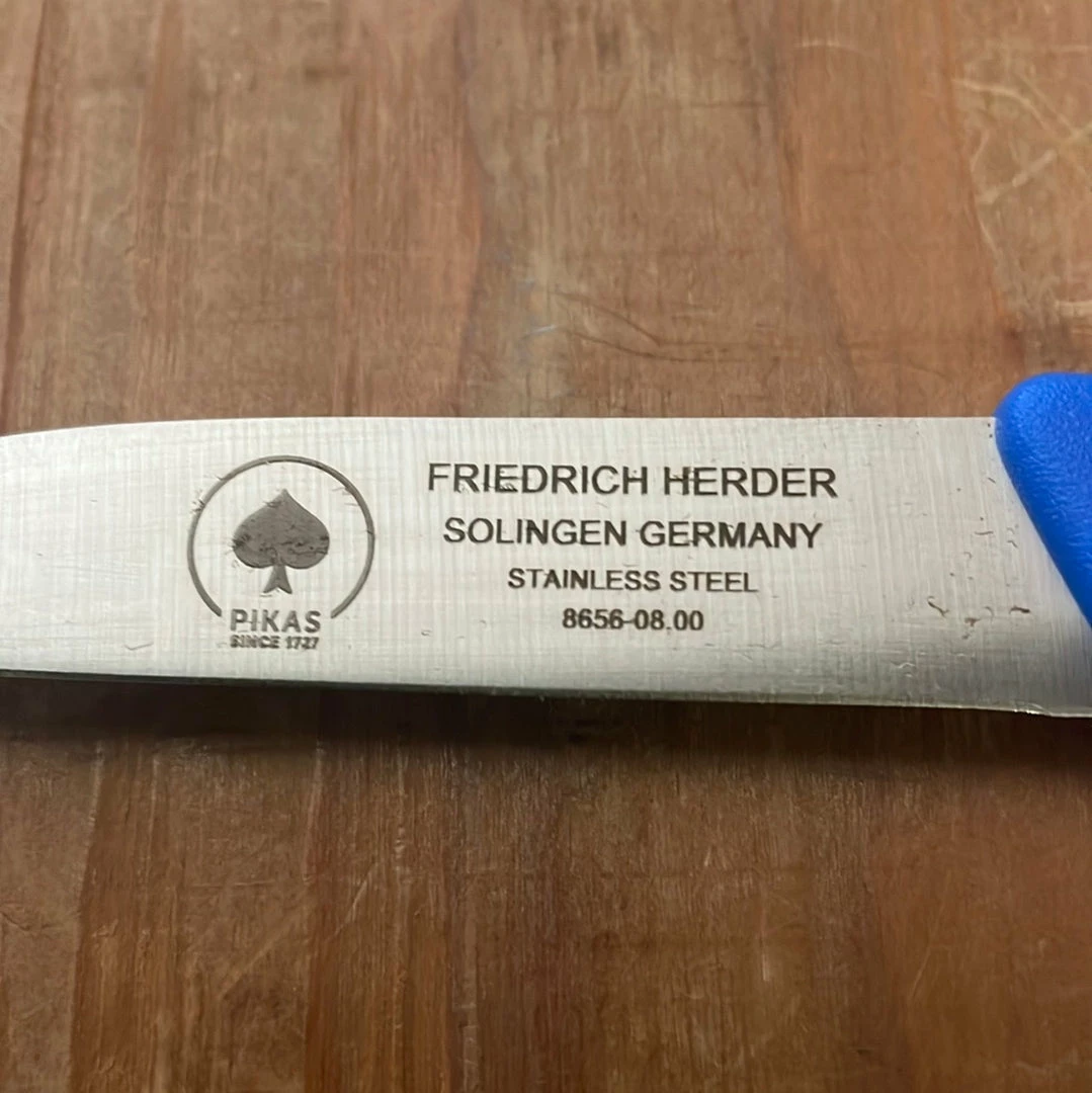 Friedr. Herder Abr Sohn company is the longest continually operating knife making operation in Solingen Germany. It’s famous Pikas spade logo was registered in 1727 although their place in Solingen’s blade making traces further back. Friedr Herder has kept many old patterns in carbon steel in production and offers a variety of new production knives for professionals and home cooks.