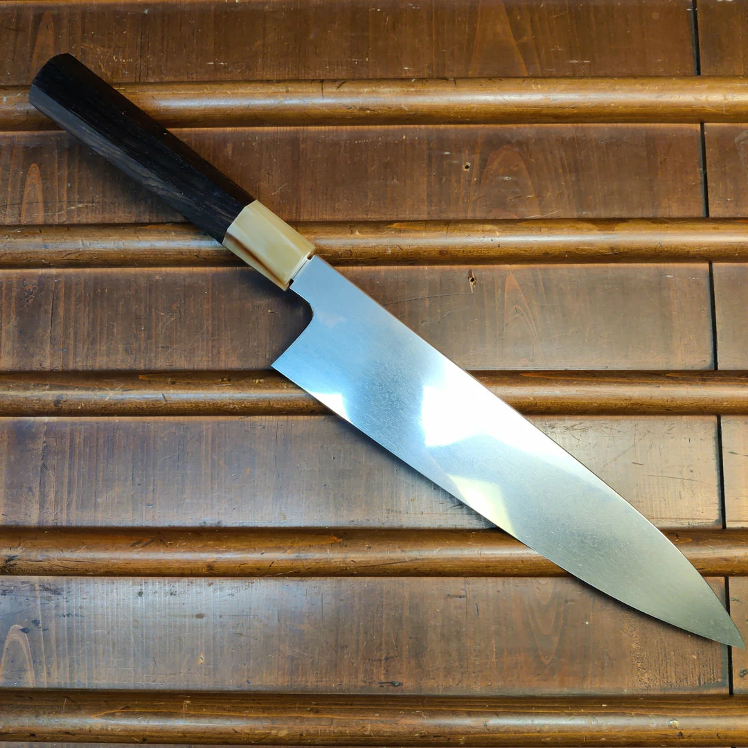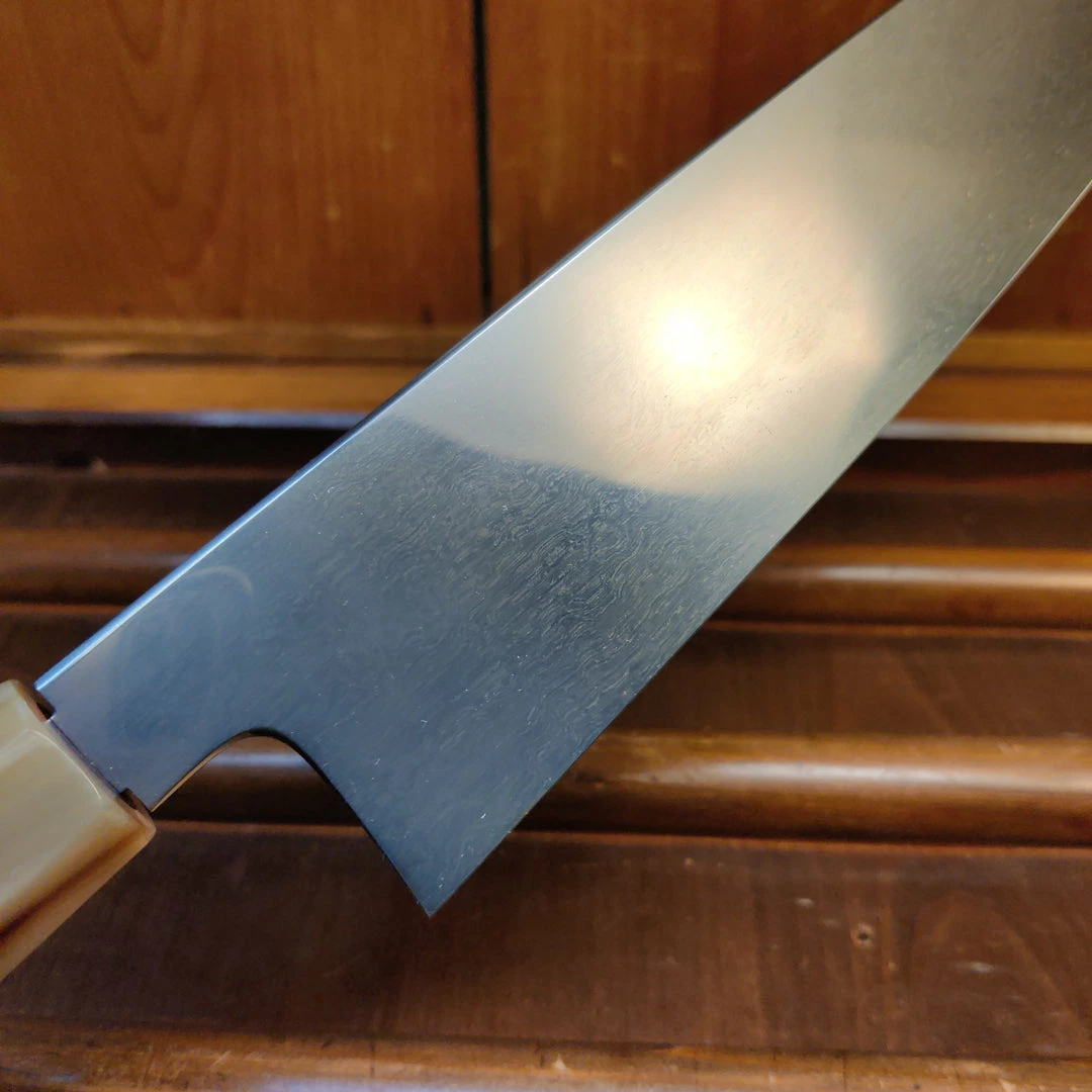 Oil quenched honyaki shirogami 1 carbon steel forged and ground by Satoshi Hashimoto, a blacksmith out of Hiroshima making very impressive suminagashi damascus and honyaki.