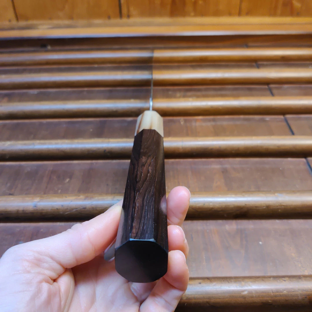 The finish polishing brings out the carbon structure in the high carbon content shirogami 1, a steel with a simple alloy composition of iron carbon and a little silica that is a true testiment to a smith’s skill in forging and heat treatment. Differential heat treated honyaki is a difficult technique that creates a blade with a hard edge and softer tougher spine and tang.