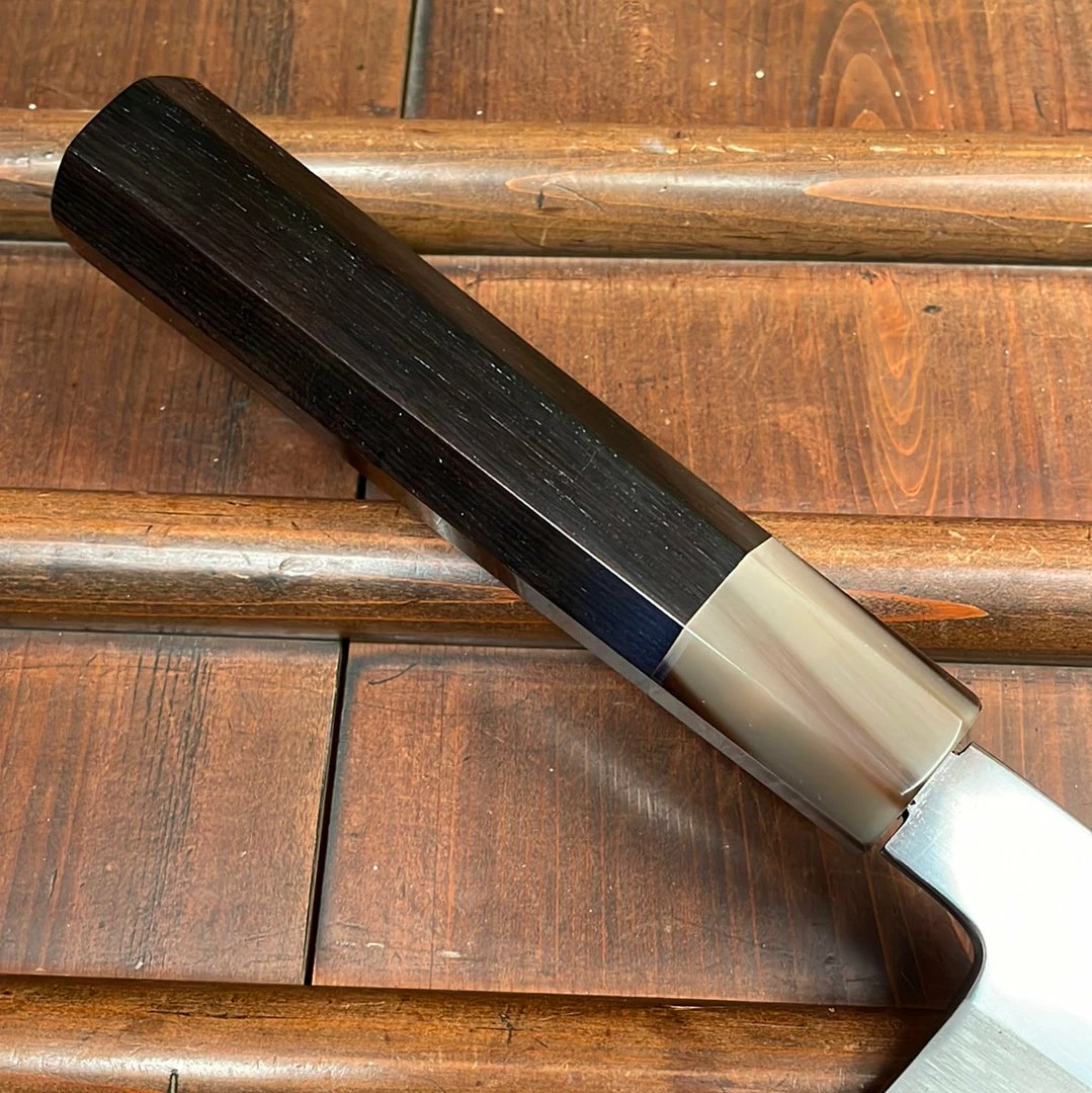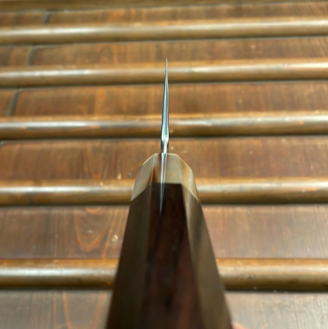 Hand forged iron clad aogami 2 gyuto with blonde horn ferruled ebony handle. These have a tall heelย andย a robust feel with a thicker spine over the heel and belly.ย A strong distal taper makes for a nimble fine tip.