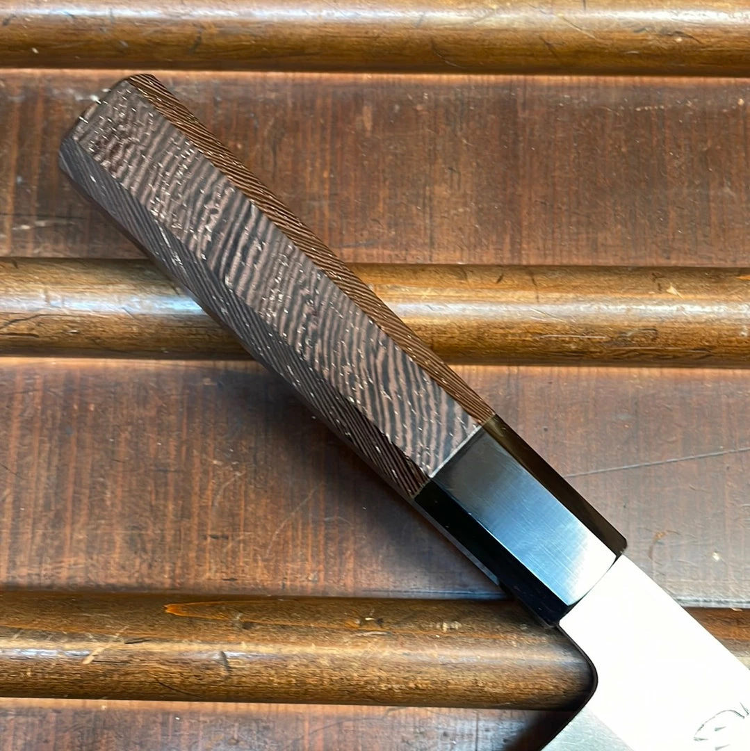 Forged iron clad shirogami 2 carbon steel with horn ferruled wenge handle.