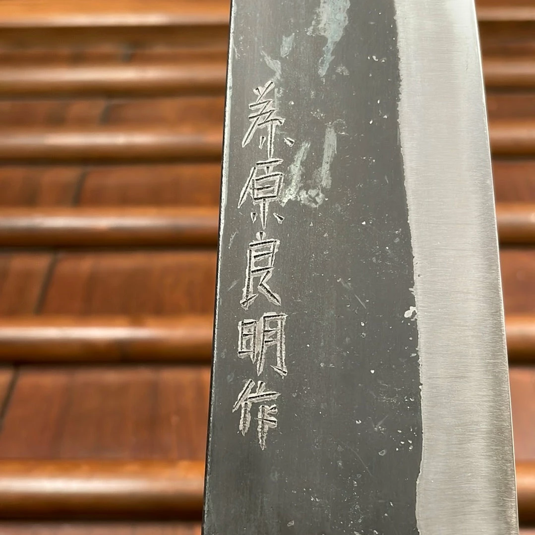Iron Clad Aogami 2 gyuto that retains its dark kurouchi finish from pine charcoal heat treatment. This is a heavier weight gyuto with a strong meat cutting bias.
