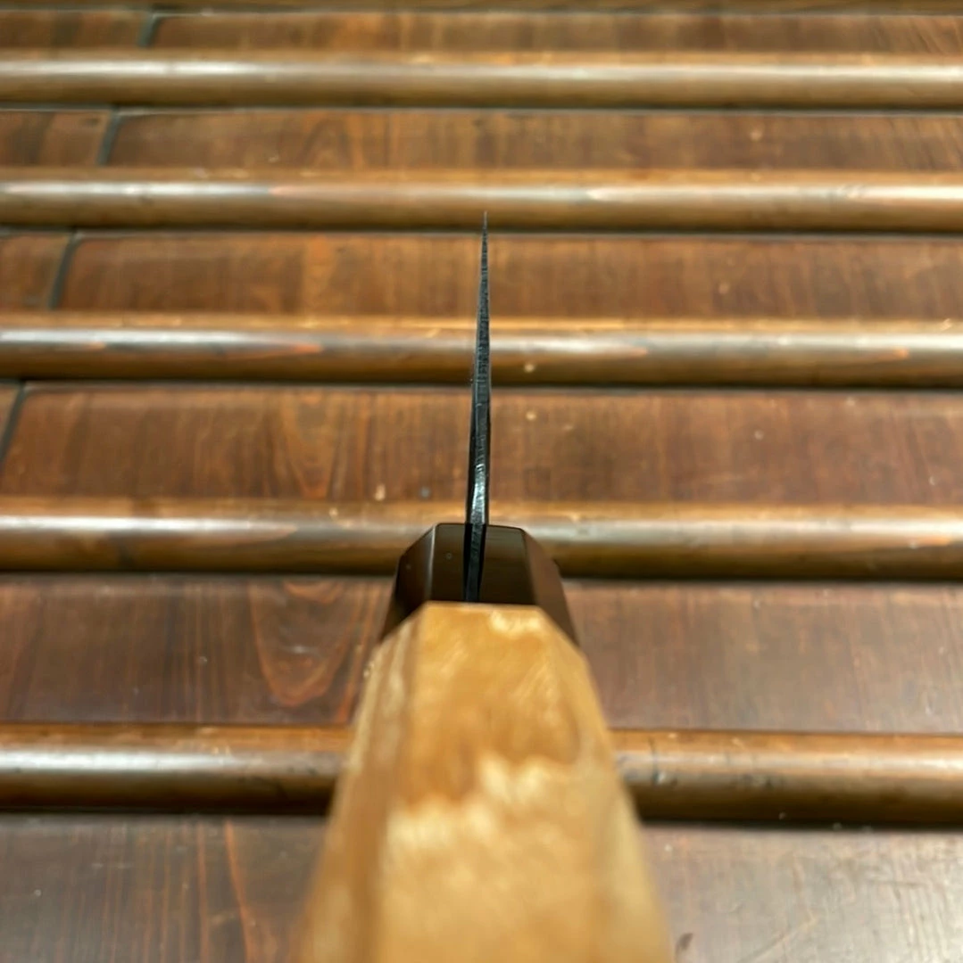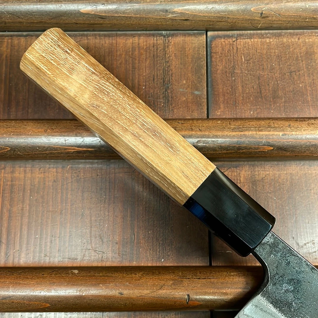 Hand forged in Tosa, these rustic finished mild steel and iron damascus clad aogami 2 knives have a solid middle to heavy weight feel yet are thin behind the edge. Corners of the spine and heel are eased, making for a more comfortable pinch grip with a horn and teak handle for a solid, secure feel.