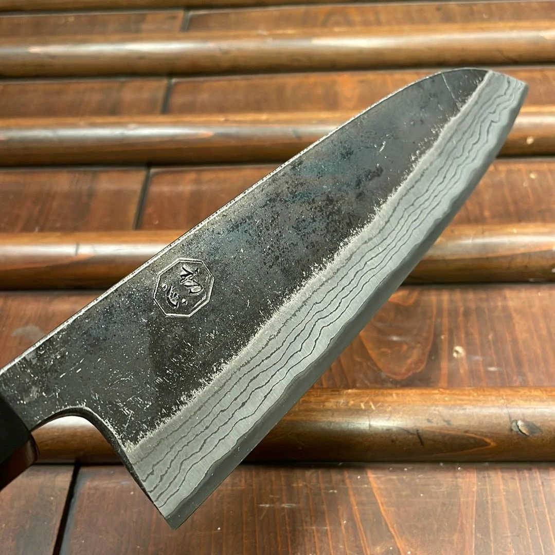 Hand forged in Tosa, these rustic finished mild steel and iron damascus clad aogami 2 knives have aย solid middle to heavy weight feel yetย areย thin behind the edge. Corners of the spine and heel are eased, making for a more comfortable pinch gripย withย a horn and teak handleย for a solid, secure feel.ย