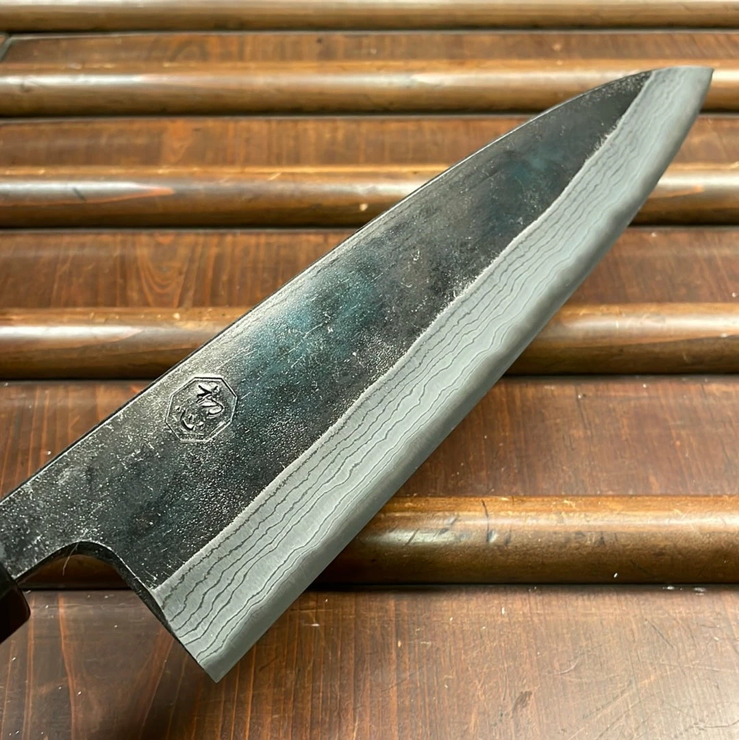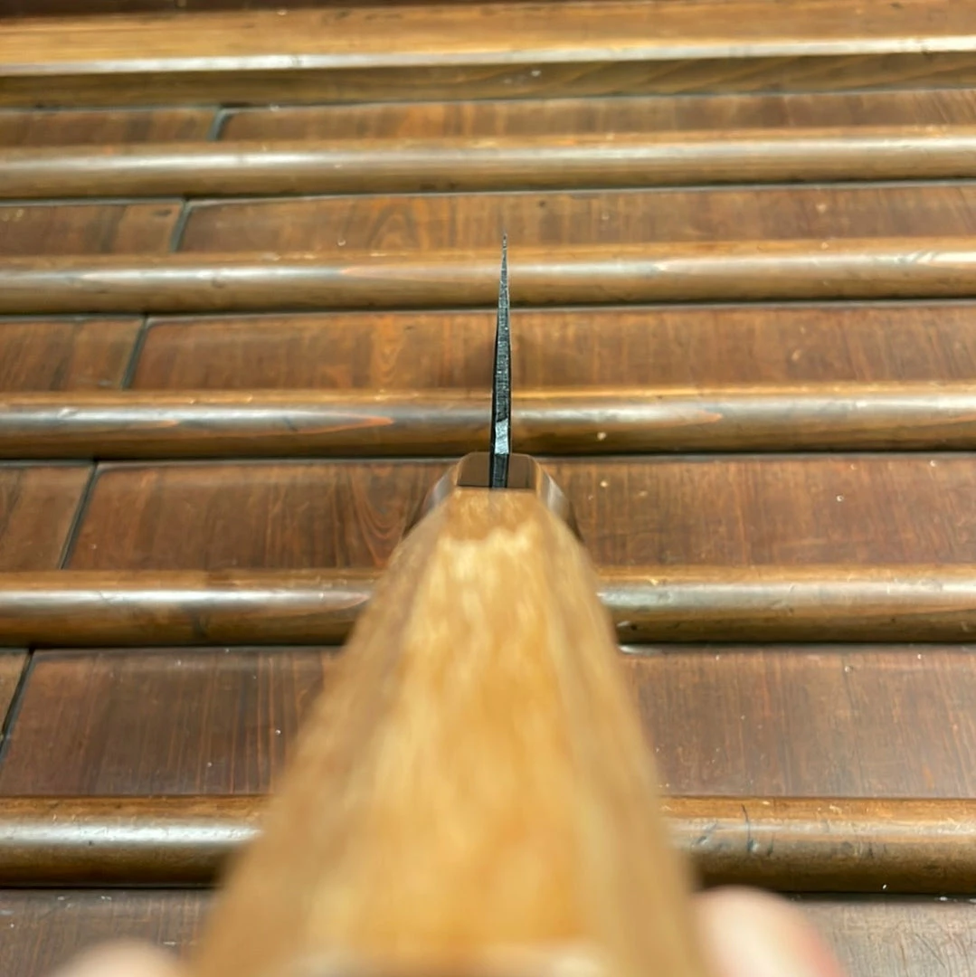 Hand forged in Tosa, these rustic finished mild steel and iron damascus clad aogami 2 knives have aย solid middle to heavy weight feel yetย areย thin behind the edge. Corners of the spine and heel are eased, making for a more comfortable pinch gripย withย a horn and teak handleย for a solid, secure feel.ย