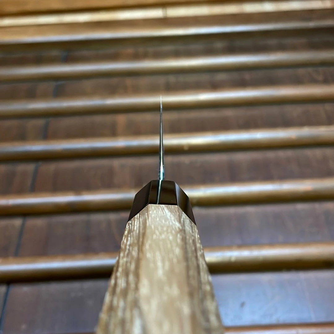 Naohito-san became known to us here from his fabulous grinds and finishes on the Konosuke Fujiyama FM knives. We have been consistently impressed with how nicely these fine blades cut and at the quality of his finish work. It is exciting to get more knives finished by this young but very talented sharpener and now blacksmith as Naohito-san has begun to forge some of his own knives.