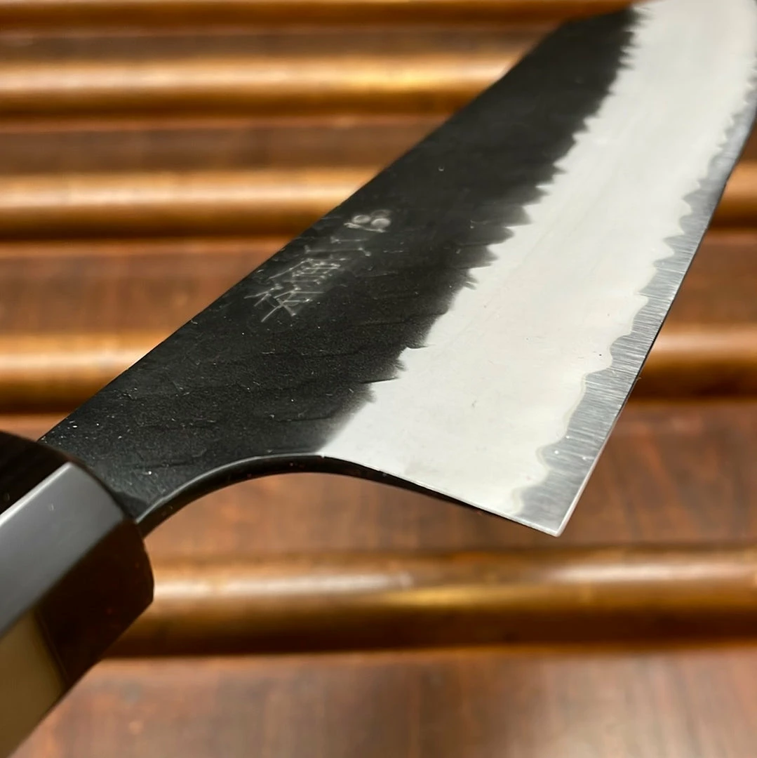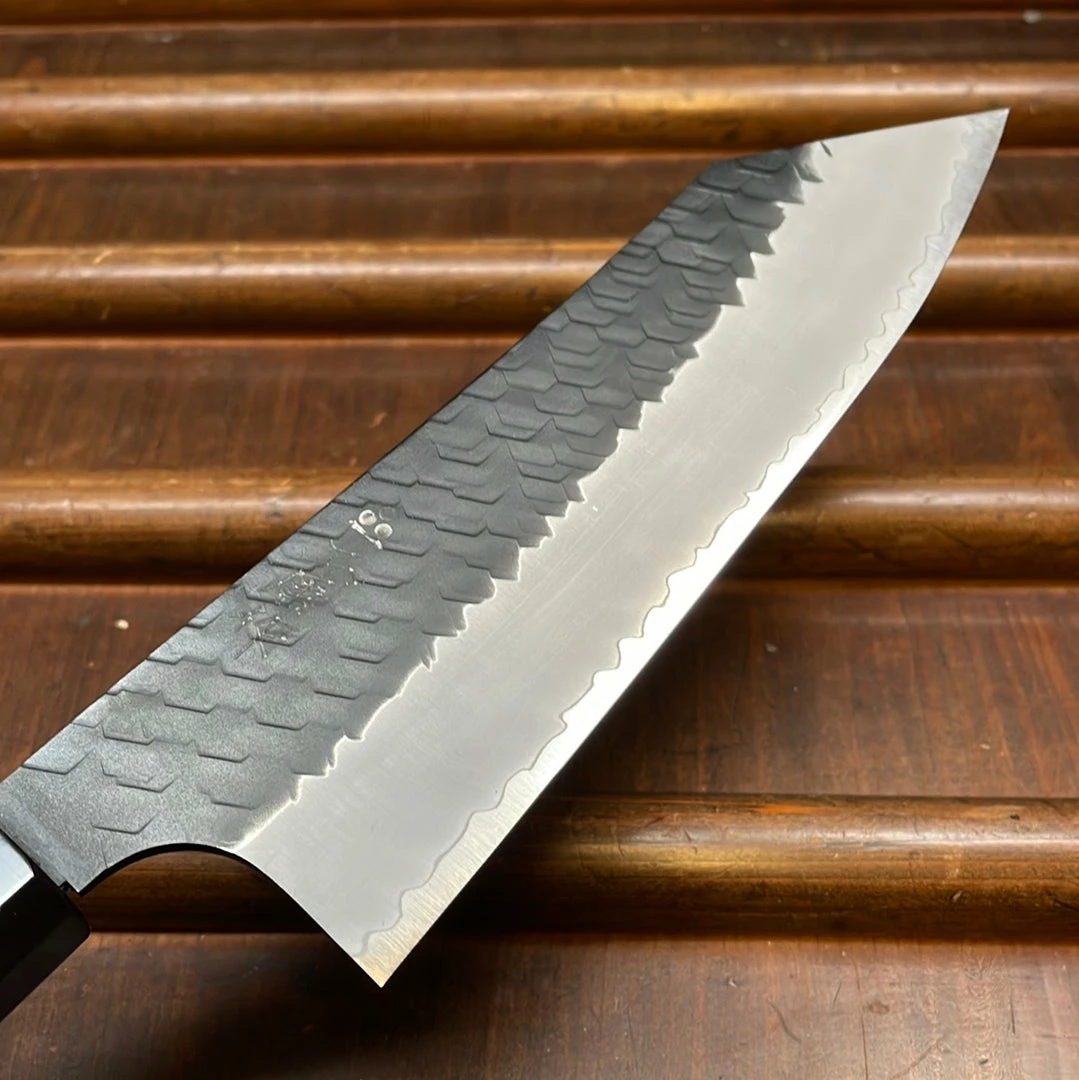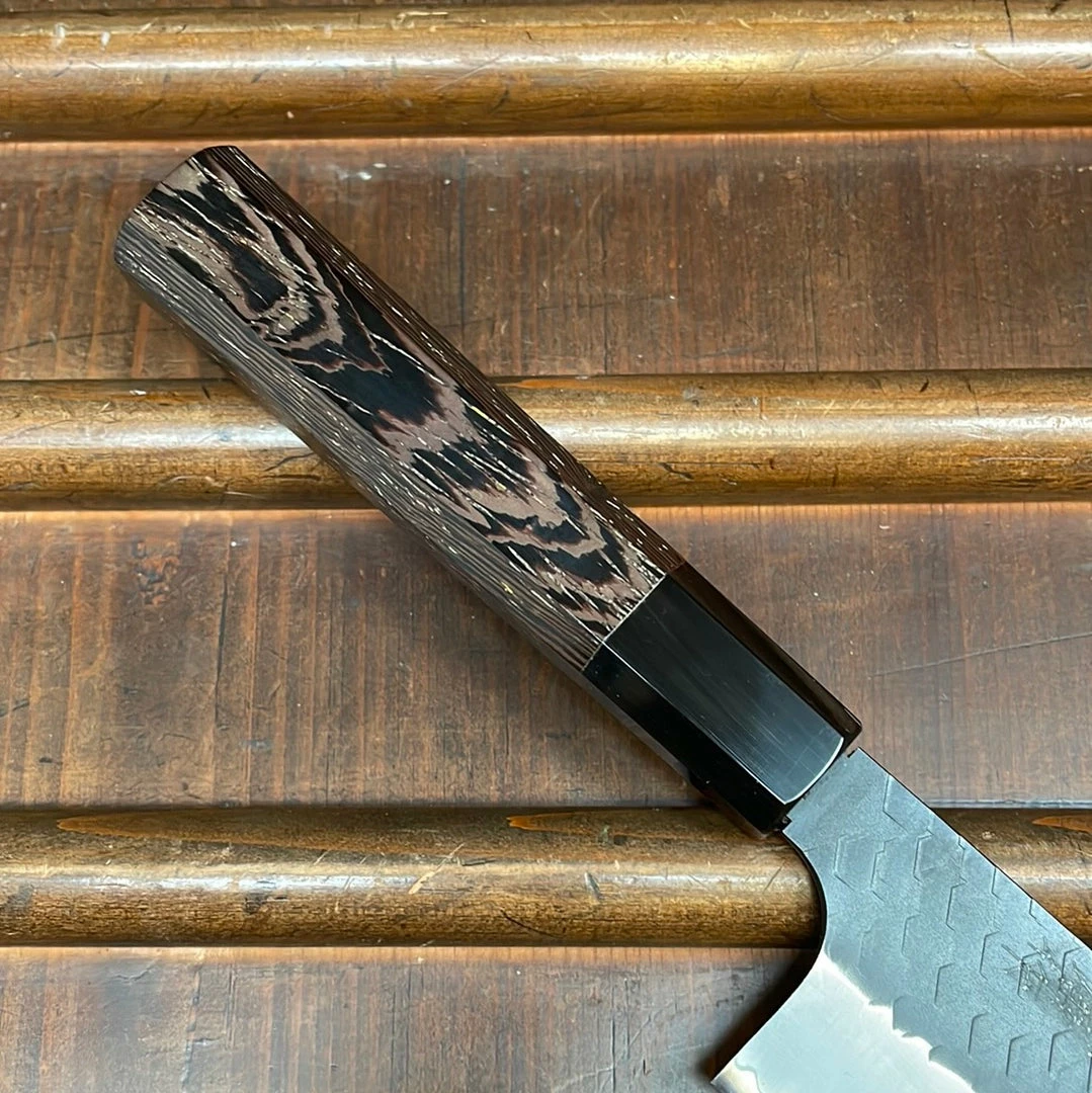 Forged stainless clad SG2 powder metal with hammer marked ‘tsuchime cladding and octagonal wenge handle. SG2 takes a very fine edge easily for a stainless steel of its hardness (63/64) and holds it nicely.ย