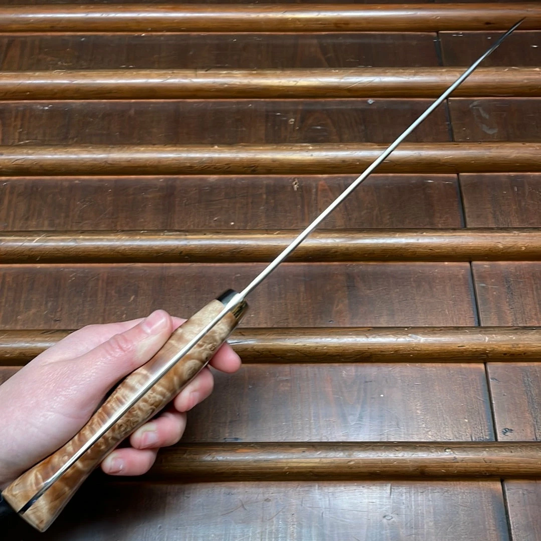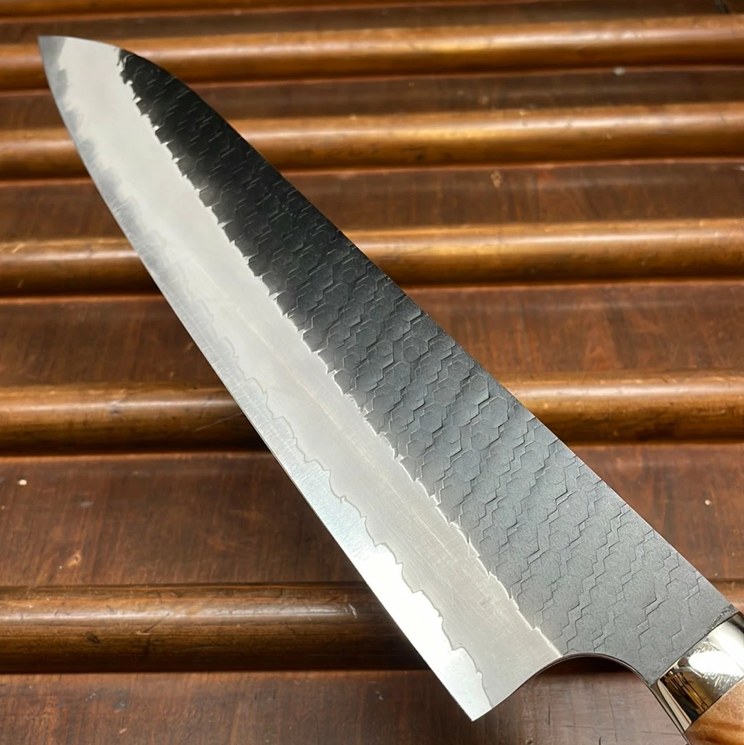 Forged stainless clad SG2 powder metal with hammer marked tsuchime cladding and octagonal wenge handle. SG2 takes a very fine edge easily for a stainless steel of its hardness (63/64) and holds it nicely.