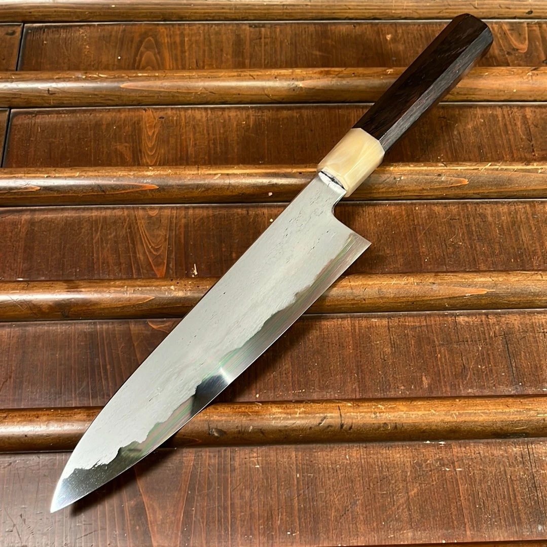 Tora-san forges an aogami 2 carbon steel and wrought iron blade that Naohito-san givesย a convex hamaguri grindย withย an elegant hazy finish on the wrought iron and a bright near mirror finish on the aogami 2 hagane core. This is a much different material than is typically found on mild steel or iron clad carbon steel knives.ย