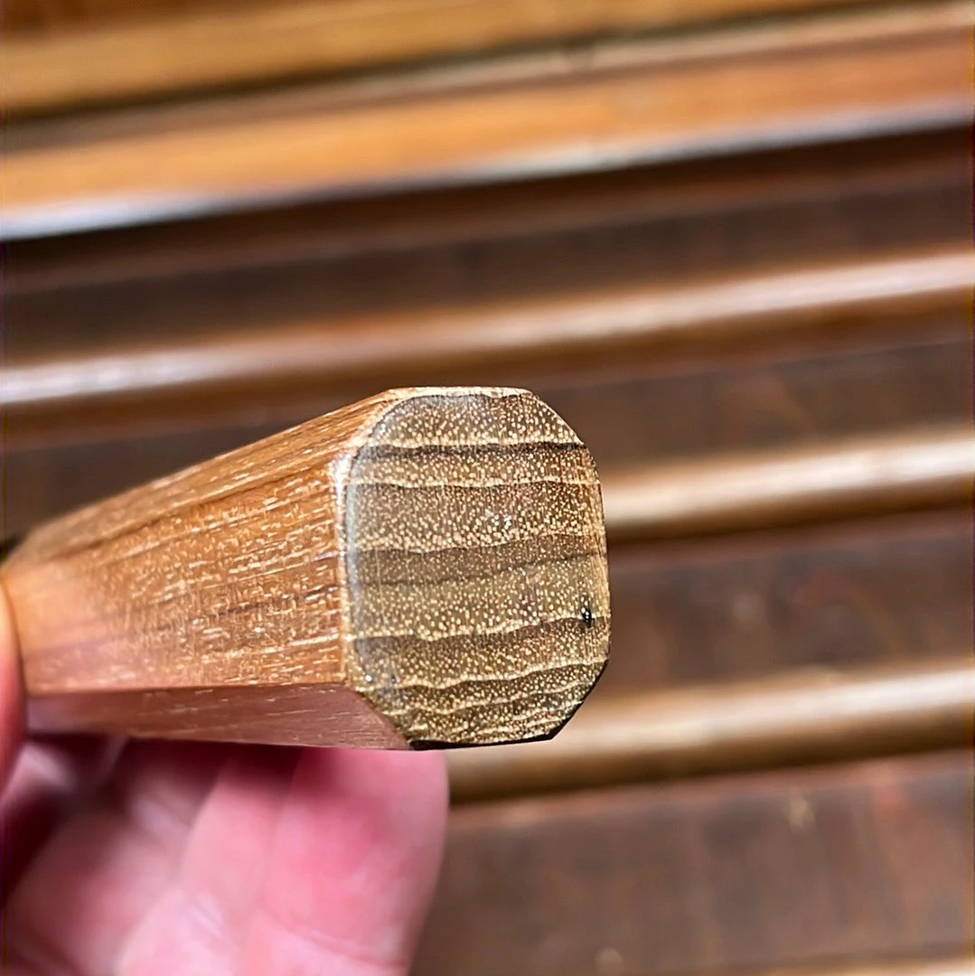 Yoshikane’s hand forged SKD semi-stainless coreย with stainless nashiji finished stainless cladding and octagonal teakย handle withย horn ferrule.