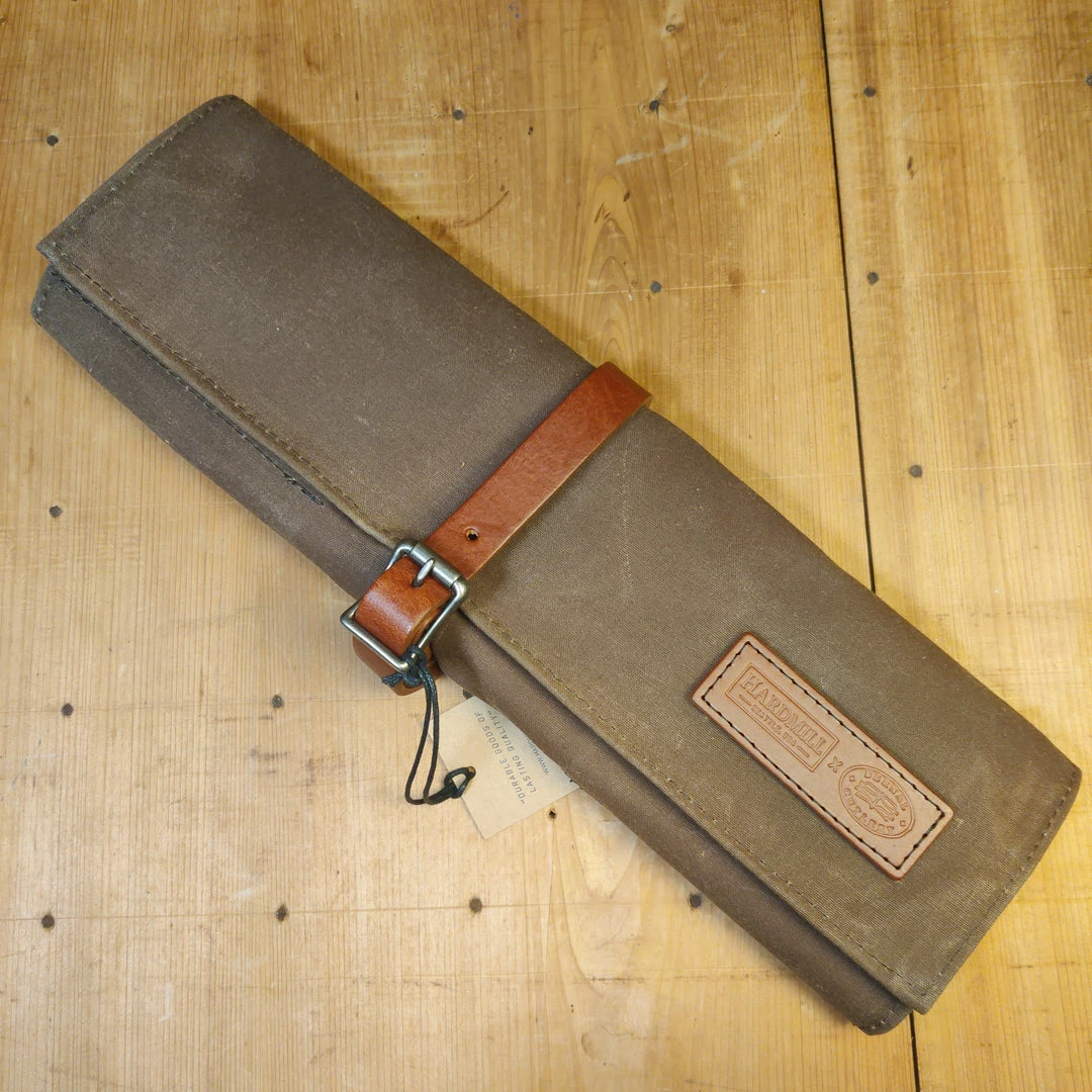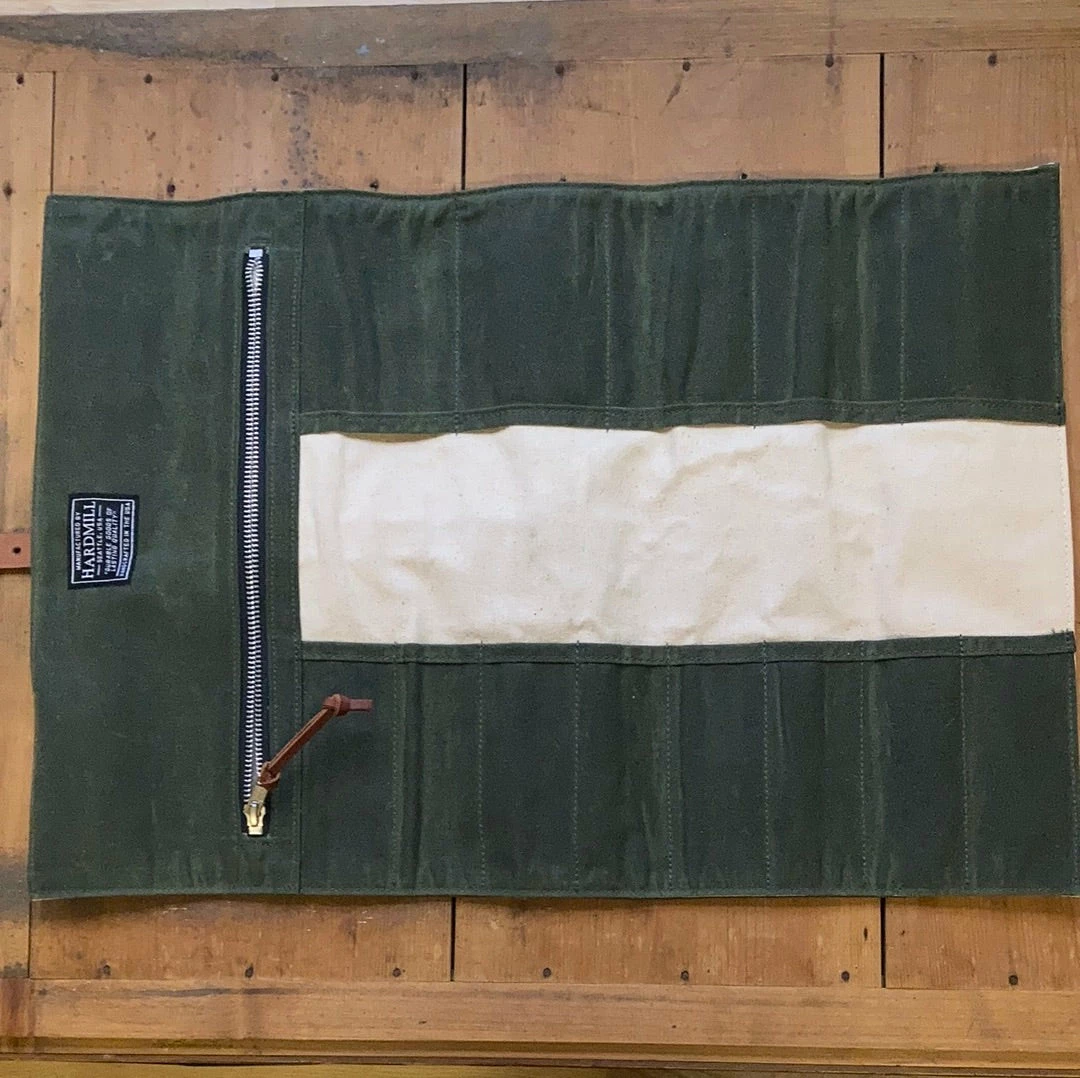 Hardmill tool roll made with waxed canvas or denim, with leather strap and chromed buckles.ย ย Has 5 larger slots on one side and 8 smaller slots on the other as well as a zippered pouch for smaller tools. Storing any knives with guards is highly recommended.