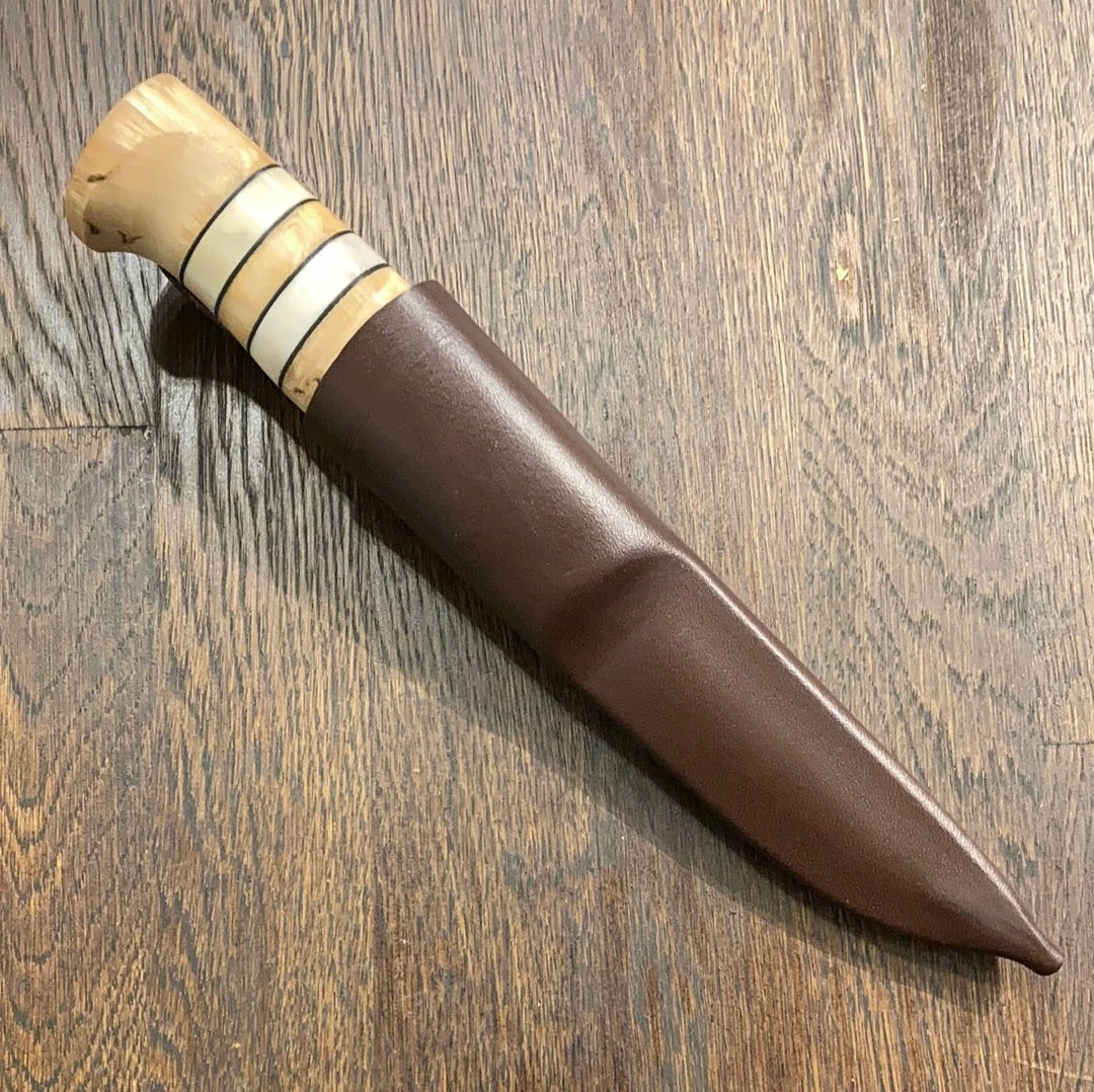 Arv is a versatile, lifelong companion that will handle cutting tasks with ease. This heritage knife has a medium size handle made from carefully selected curly birch stacked together with leather and staghorn. Shaped by hand to a smooth finish suitable for small to medium size hands.