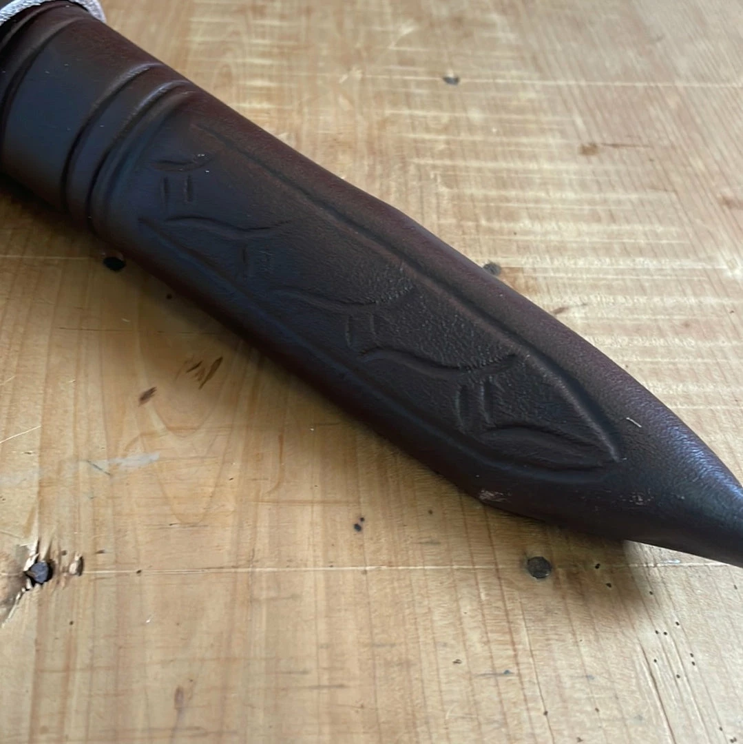 Viking comes with a traditional back sewn leather sheath to hang in its leather loop on the belt.