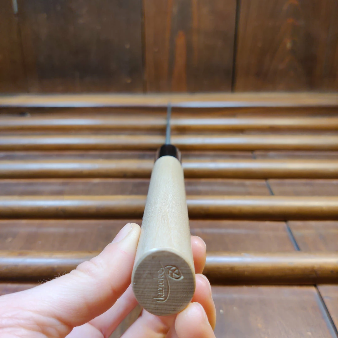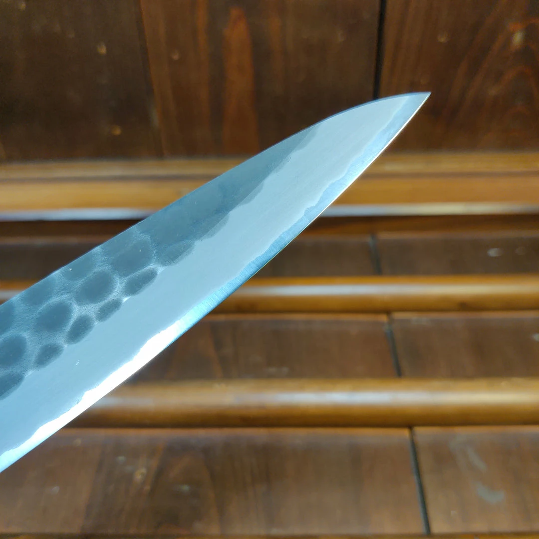 Mutsumi Hinoura has been training and working in Sanjo with his father, master smith Tsukasa Hinoura, since 2001. His knives are similar, with good distal tapers and wide kiriba style bevels, and really wonderful heat treatments. They both have a lot of experience with hunting and outdoor knives, and their kitchen knives seem to carry some of the same qualities of toughness.