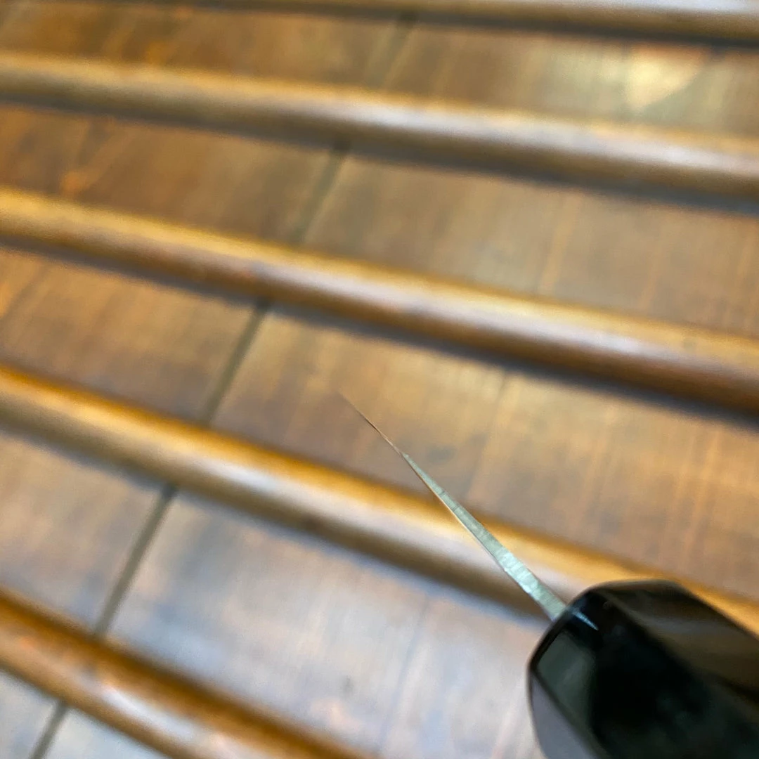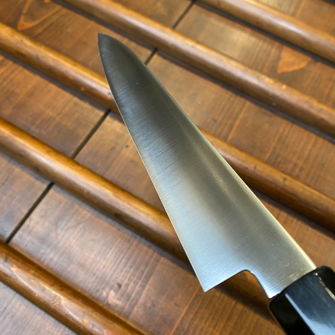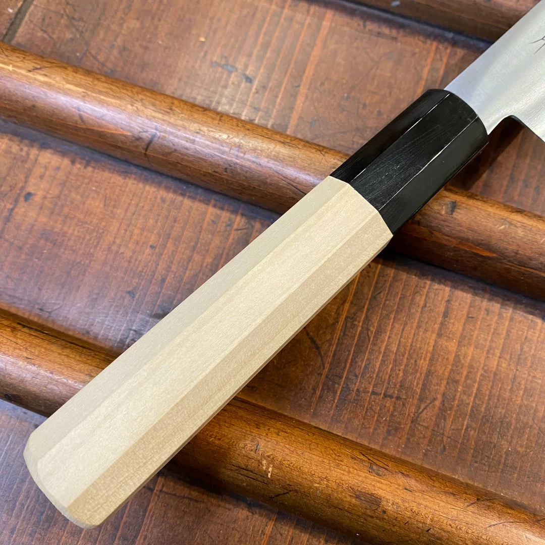 Hand ground VG10 mono steel with a nice taper and convex hamaguri grind. This fine grind makes for smooth cutting and excellent food release with a long edge life and excellent stainless property. VG10 can be more work to sharpen as they get sharpened down but that will take quite some time as the thin convex grind keeps the blade thin as it gets sharpened in.