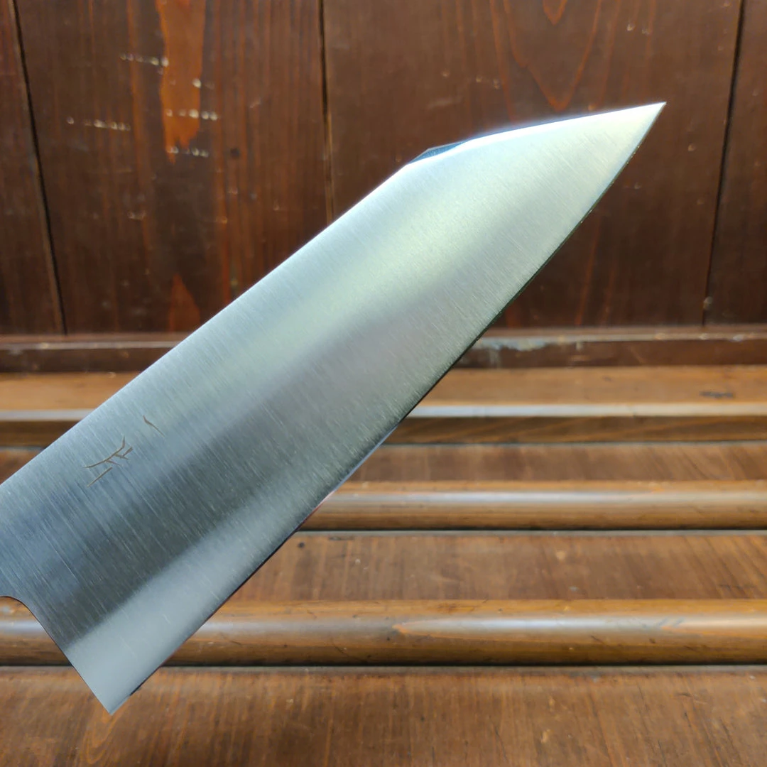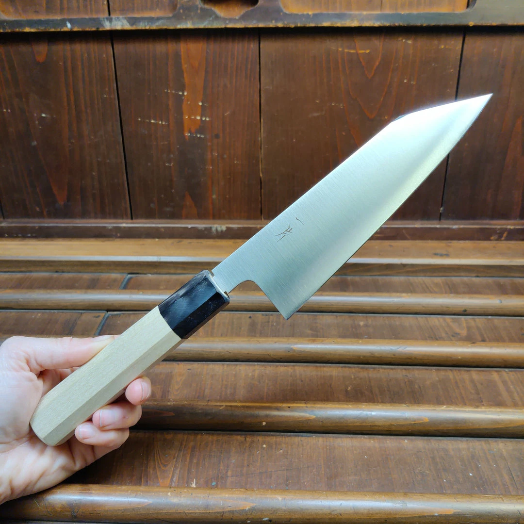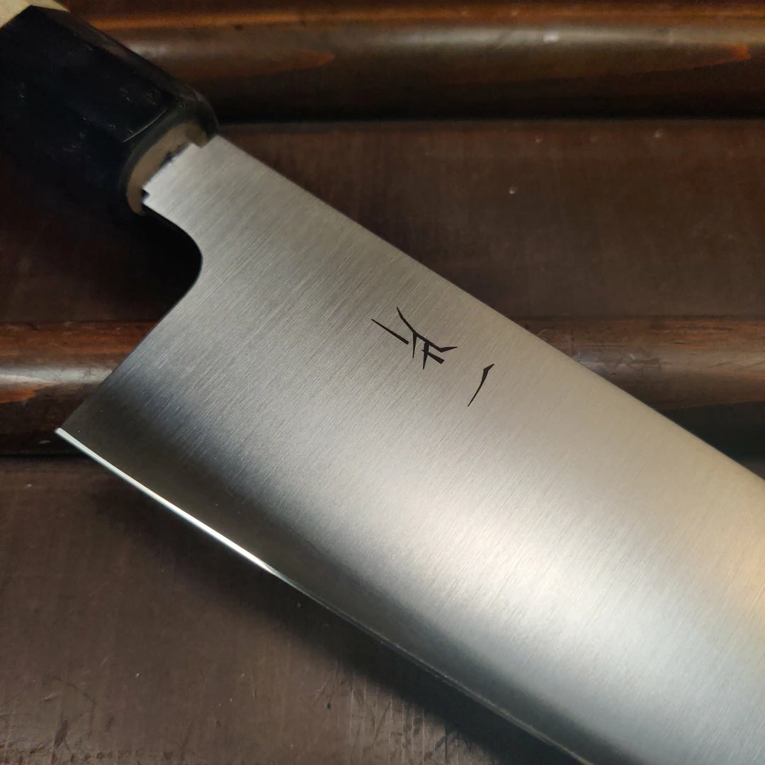 Hand ground VG10 mono steel with a nice taper and convex hamaguri grind. This fine grind makes for smooth cutting and excellent food release with a long edge life and excellent stainless property. VG10 can be more work to sharpen as they get sharpened down but that will take quite some time as the thin convex grind keeps the blade thin as it gets sharpened in.ย