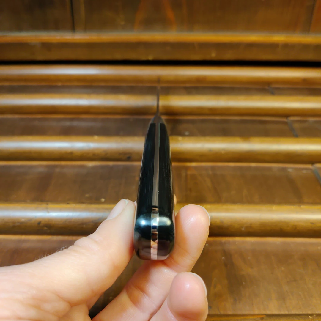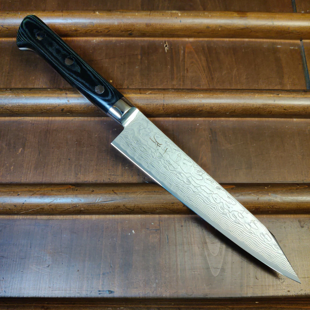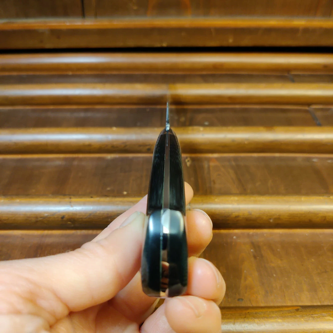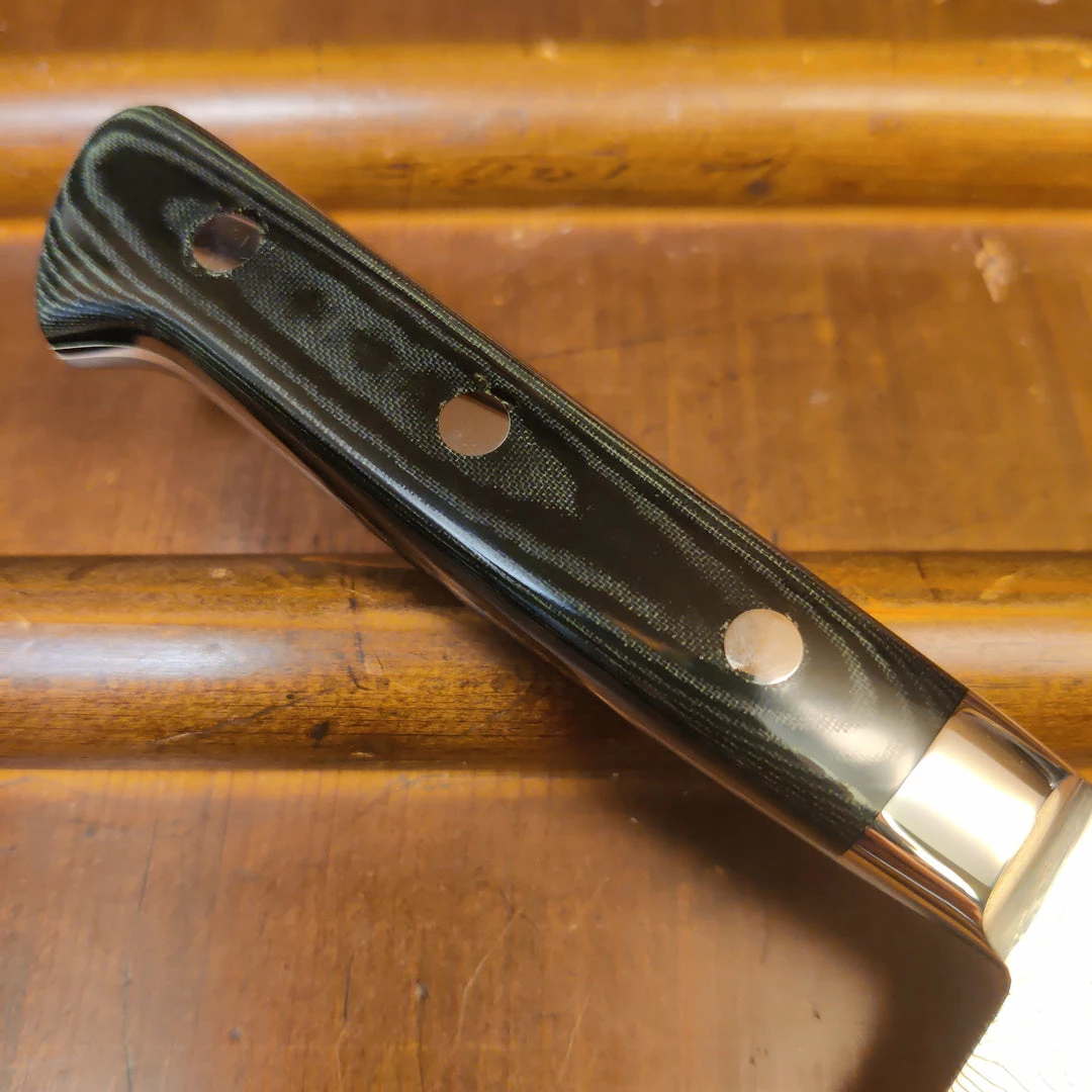 Semi-stainless SG2 core a nickle suminagashi cladding. Hand ground for aย nice taper and convex hamaguri shape. This fine grind makes for smooth cutting and excellent food release with a long edge life andย near stainless property.ย SG2 will hold a thinner edge for longer than most stainless steels, though if left wet or otherwise neglected, edge life will be effected and corrosion can form. Expected a soft patina over time that willย accentuate the suminigashi patterning.
