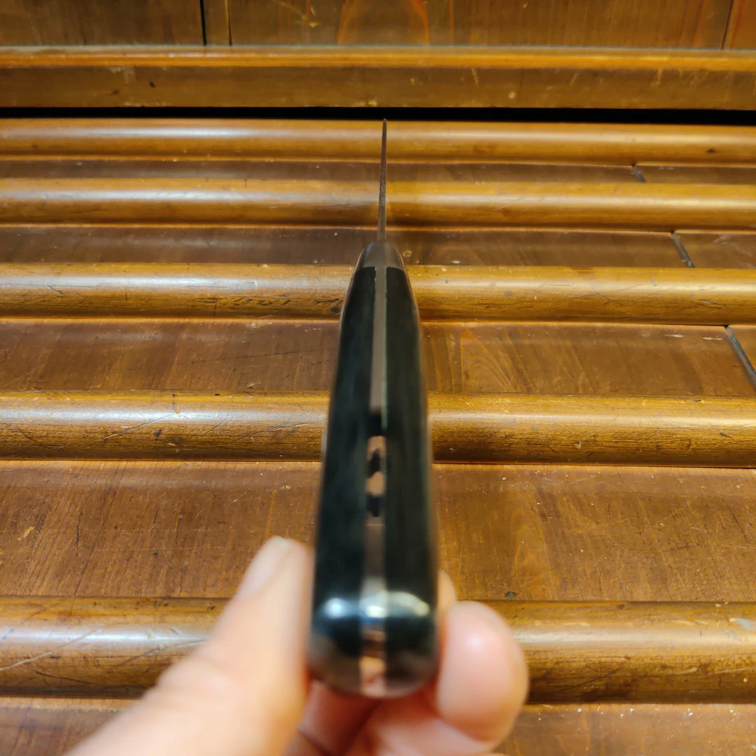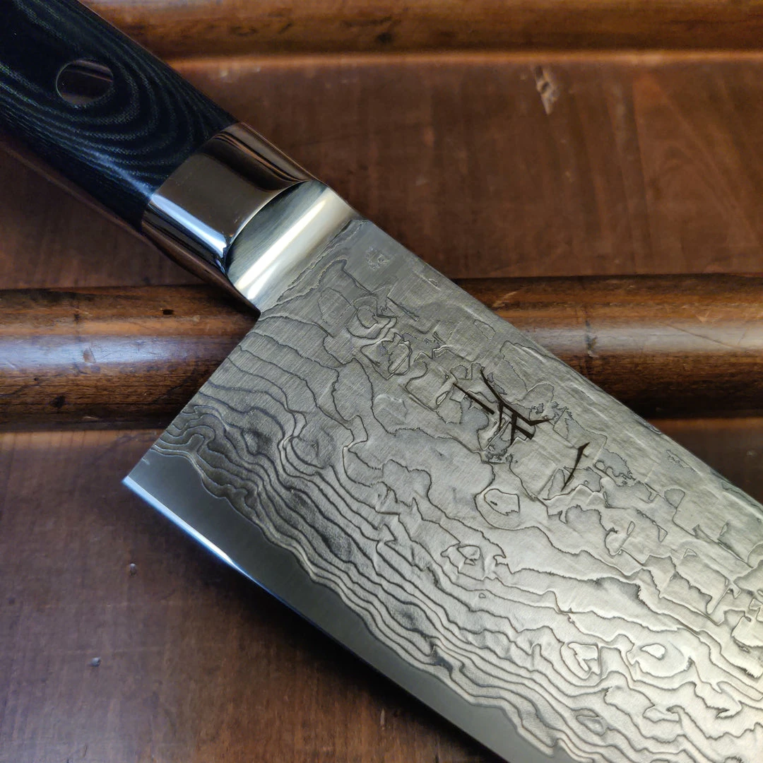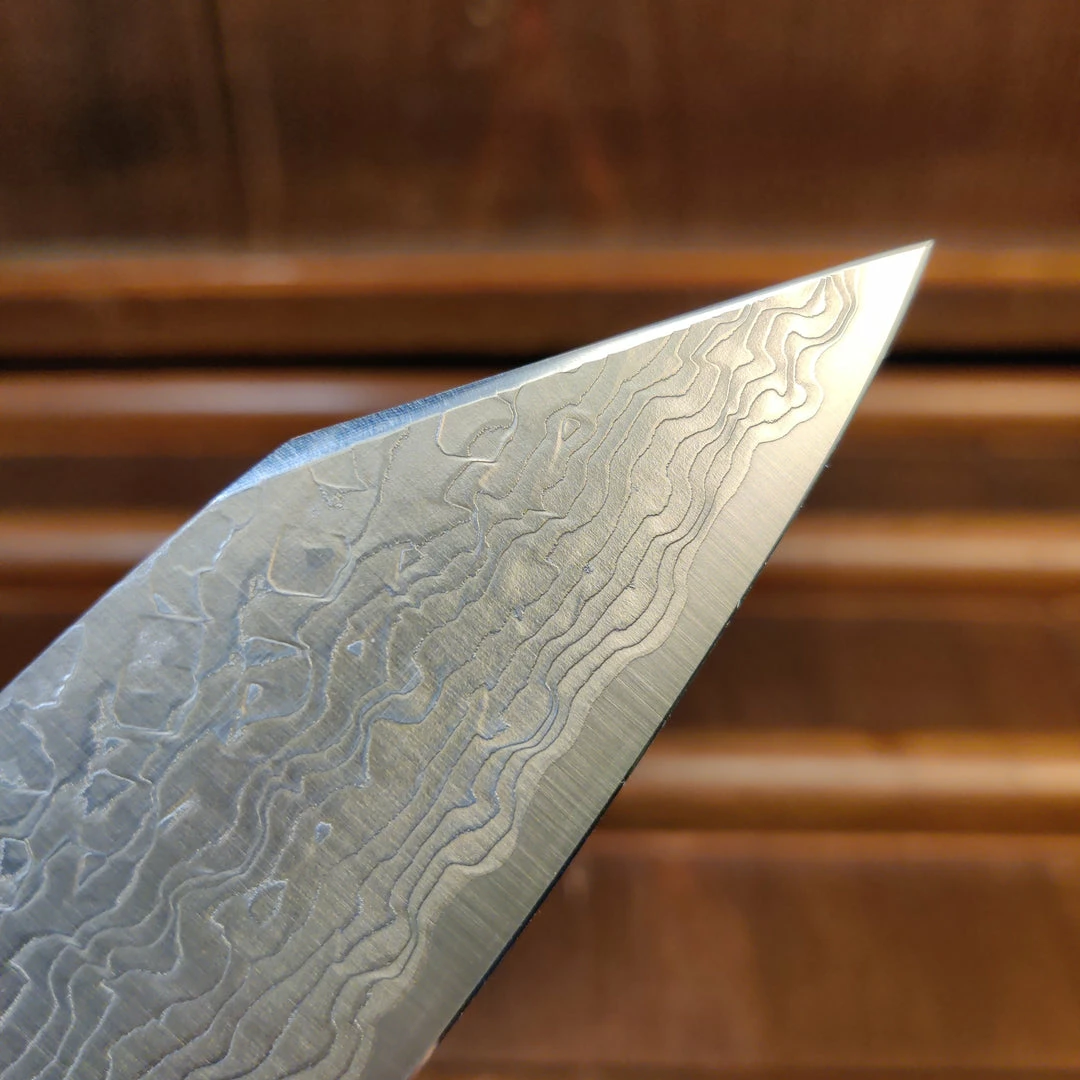 Semi-stainless SG2 core a nickle suminagashi cladding. Hand ground for a nice taper and convex hamaguri shape. This fine grind makes for smooth cutting and excellent food release with a long edge life and near stainless property. SG2 will hold a thinner edge for longer than most stainless steels, though if left wet or otherwise neglected, edge life will be effected and corrosion can form. Expected a soft patina over time that will accentuate the suminigashi patterning.