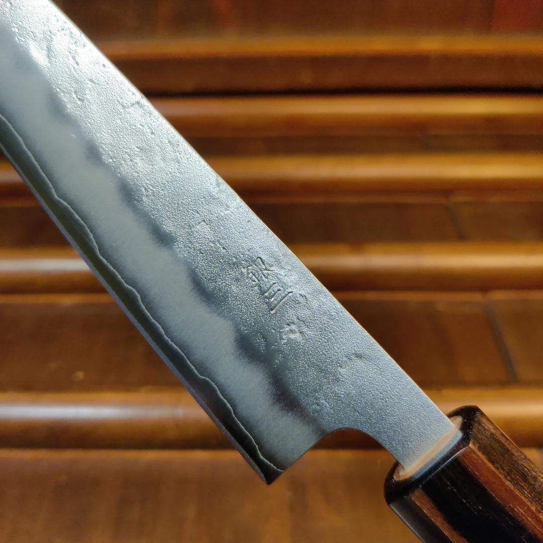 Ginsanko is a fine grained, high carbon content (1% + carbon), low chromium (13%) stainless steel with the cutting and sharpening feel of a carbon steel, but less maintenance with regard to reactivity. Although it wonโt rust, keep dry when not in use to preserve edge life.