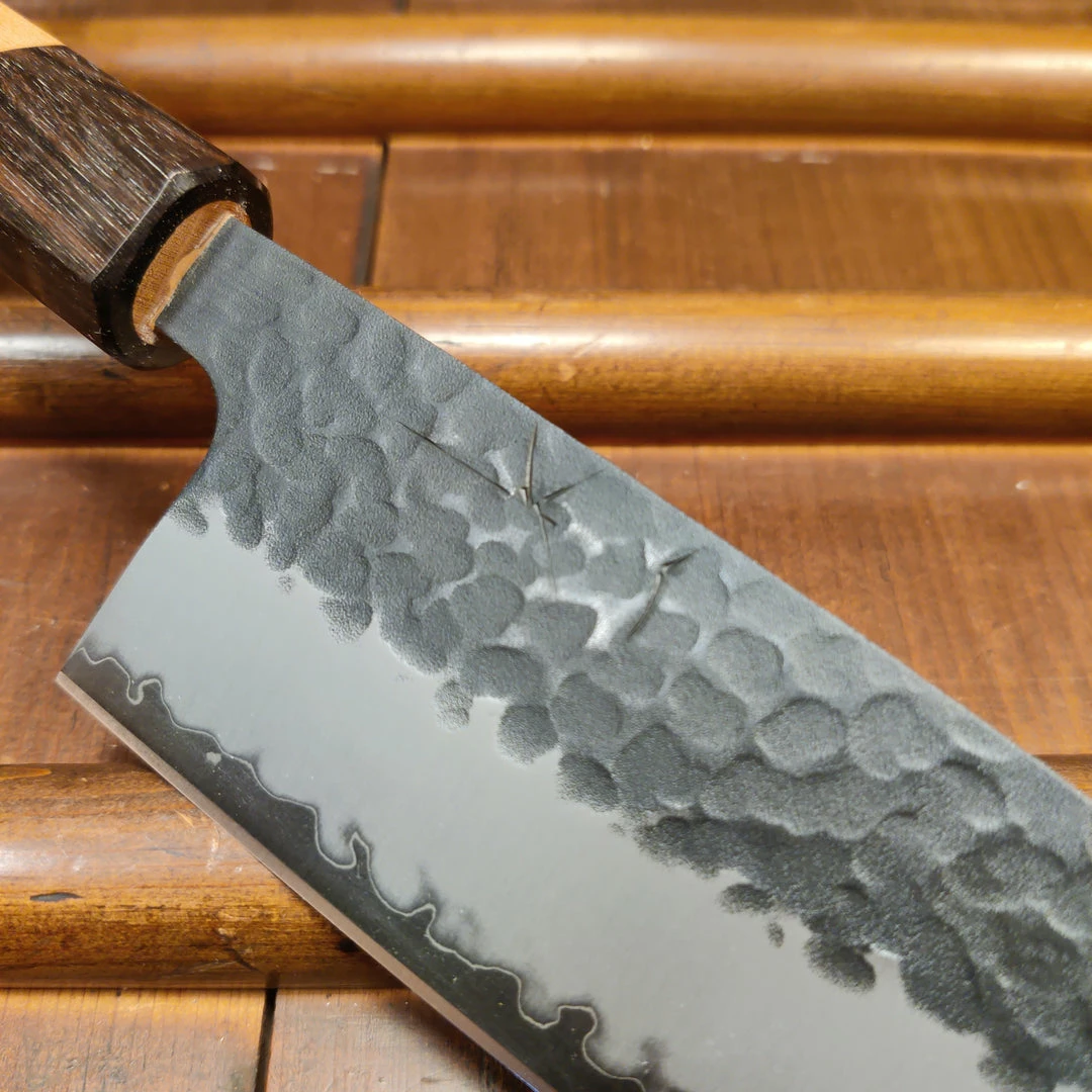 Soft stainless cladย aogami superย carbon steel with matte polished migaki finish with aย slightly convexย grind on the face of the blade. This factory forged series isย very affordable especially compared to the higher endย aogami super knives with more hand work in their forging and grinding. This treatment ofย aogami super can be sharpened at a variety of finishes depending to the users taste but it does great in the 4K finish range from our tests.ย