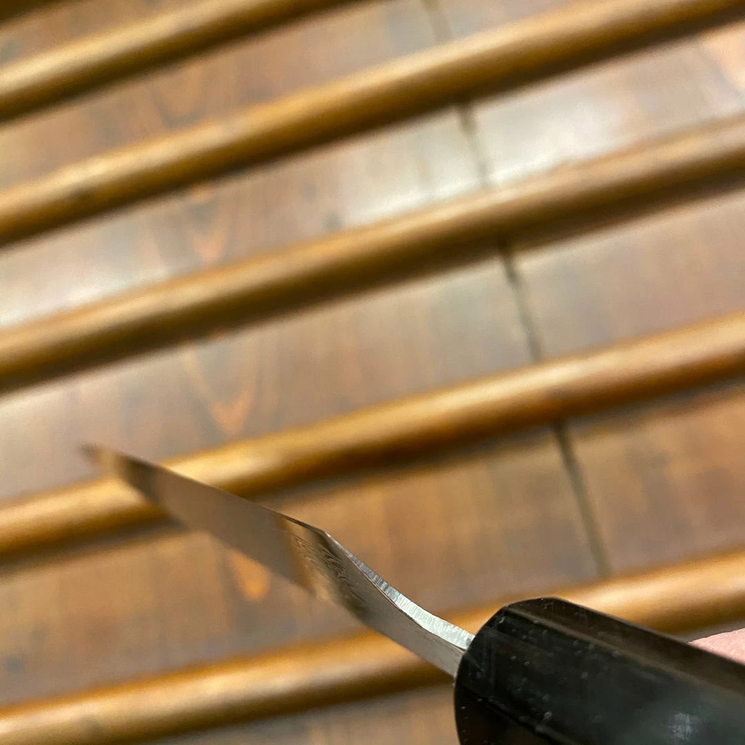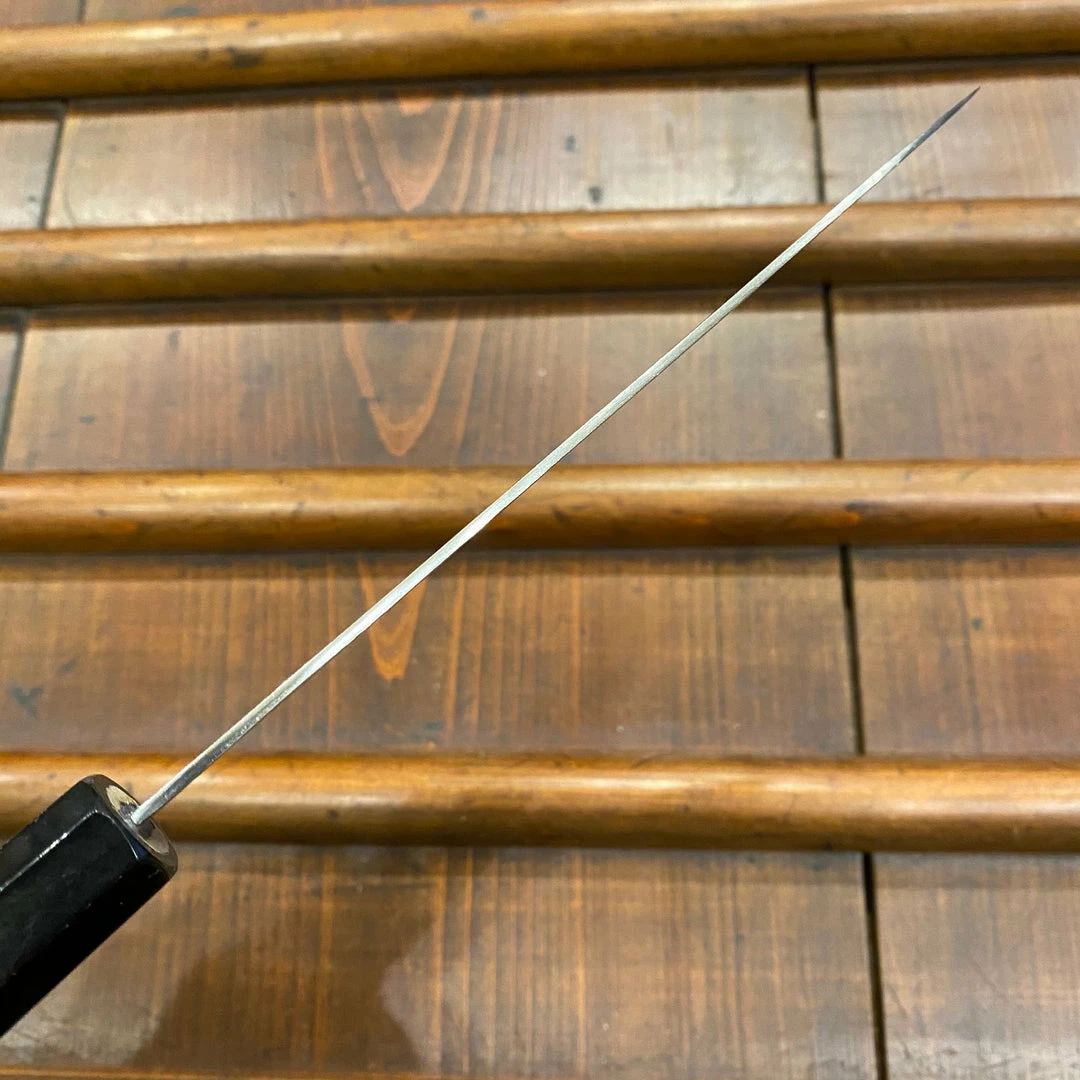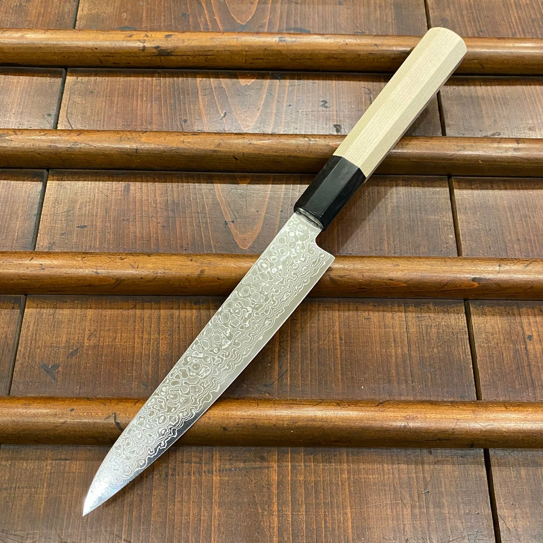 Nickel / stainless clad VG10 stainless steel ground thin with octagonal ho wood handle. Good edge life and not too difficult to sharpen for VG10, itโs thin blade will help cutting duration as well.ย