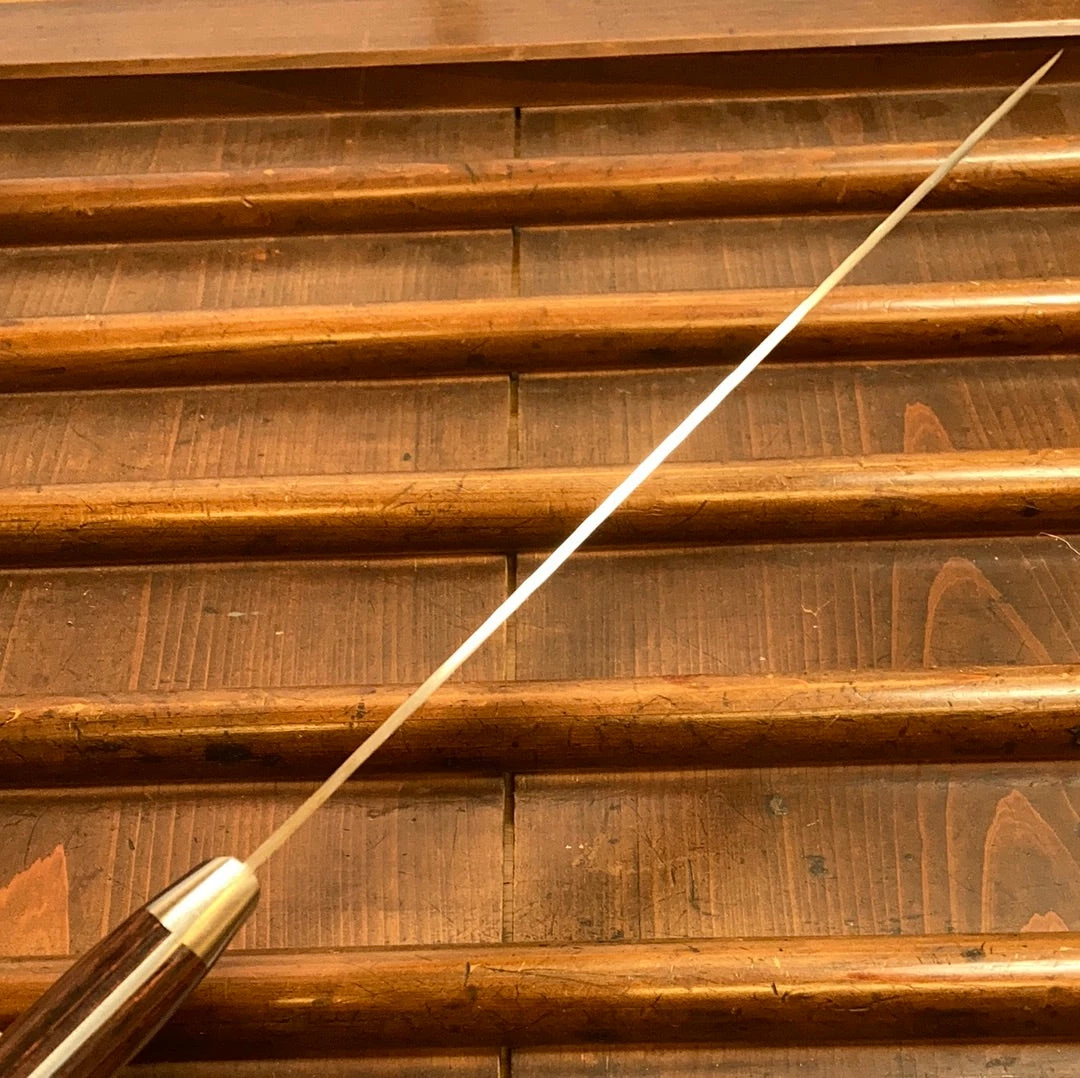 Tsuchime hammer marked nickel / stainless suminagashi damscus clad hard stainless core with mahogony colored pakka wood handles. A good combination of toughness and edge life on this series; the broken up surface area of the face of the blade makes for good food release.ย