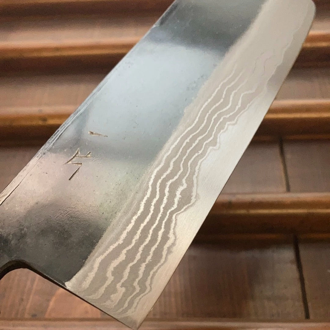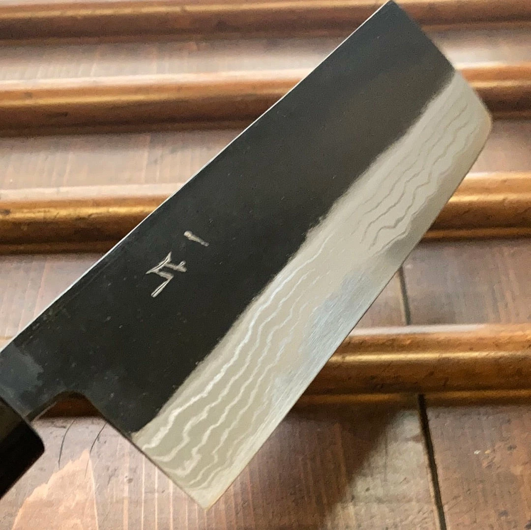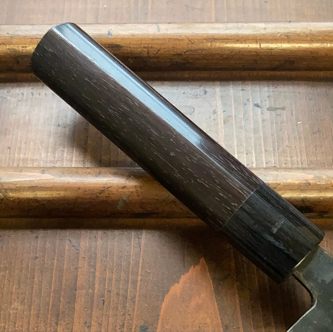 Hand forged Shirogami 2 with dark nashiji finished and pakka wood ferrule rosewoodย handle. Ground thin behind the edge for smooth vegetable work in a classic rustic style.