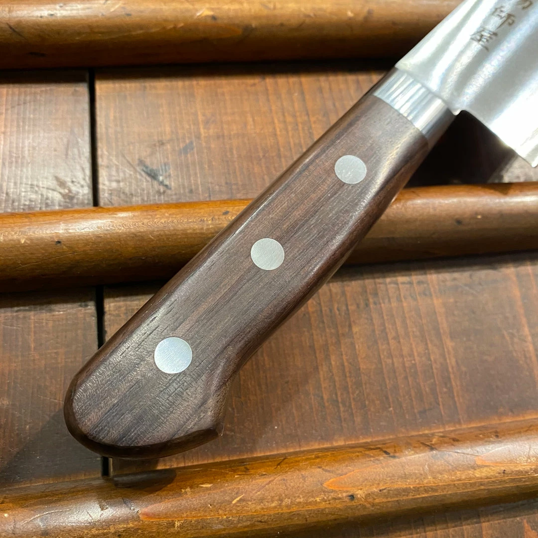 Made from mono steel VG1 stainless with rosewood handle. These knives have all the merits of a classic stainless mono steel but with better edge formation and easier sharpening. An excellent cutting feel thanks to the fine, convex hamaguri grinds.