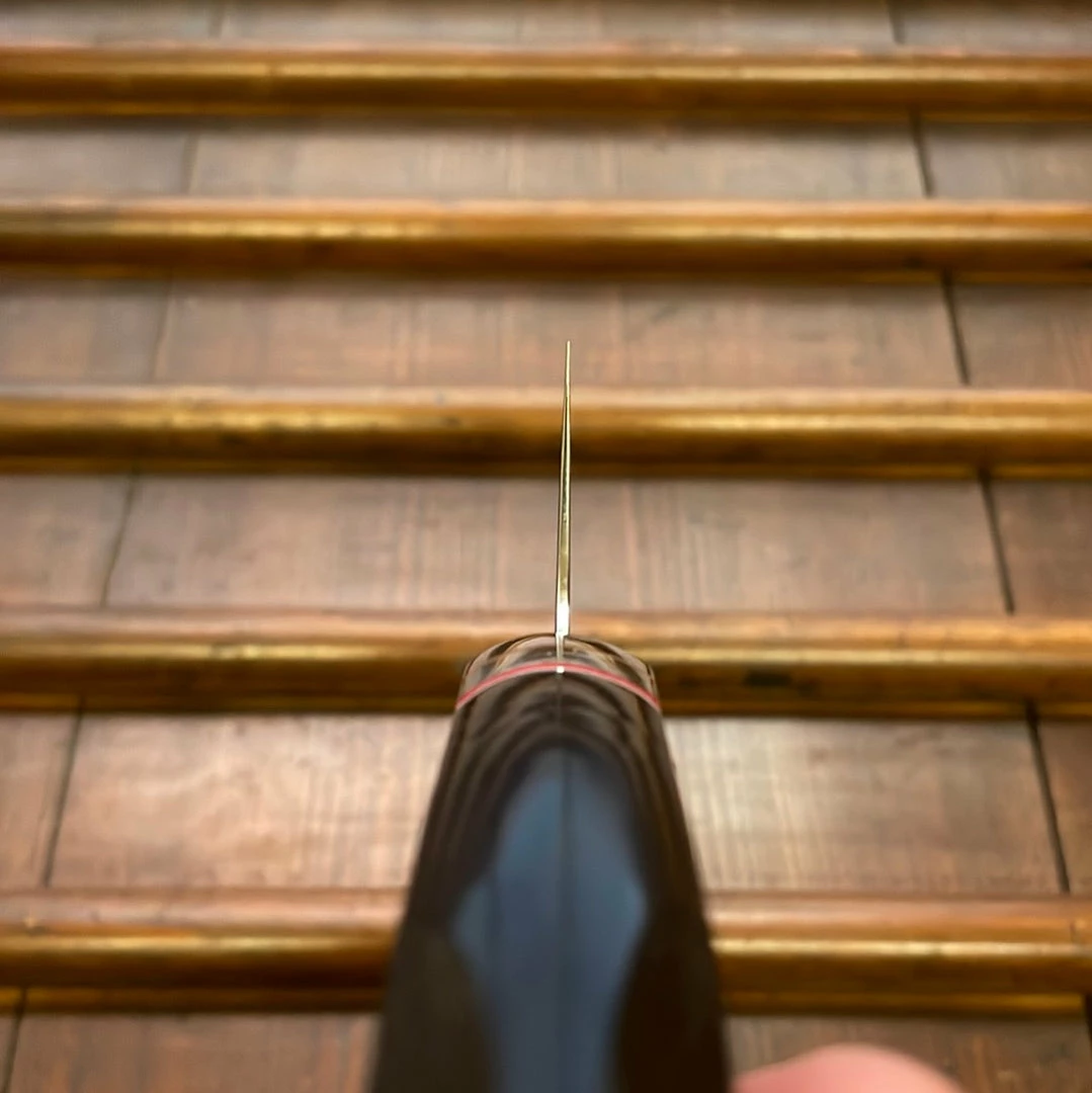 Smooth cutting with good edge life and a misty suminagashi cladding. Suminagashi means โfloating inkโ and is the Japanese term for pattern welded steel which isย colloquially known as ‘damascus’. In itself it doesnโt impart any extra performance to the knife, but is a chance for the knife maker to be creative and add an extra visual dimension to the knife.