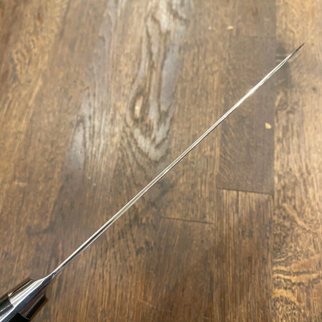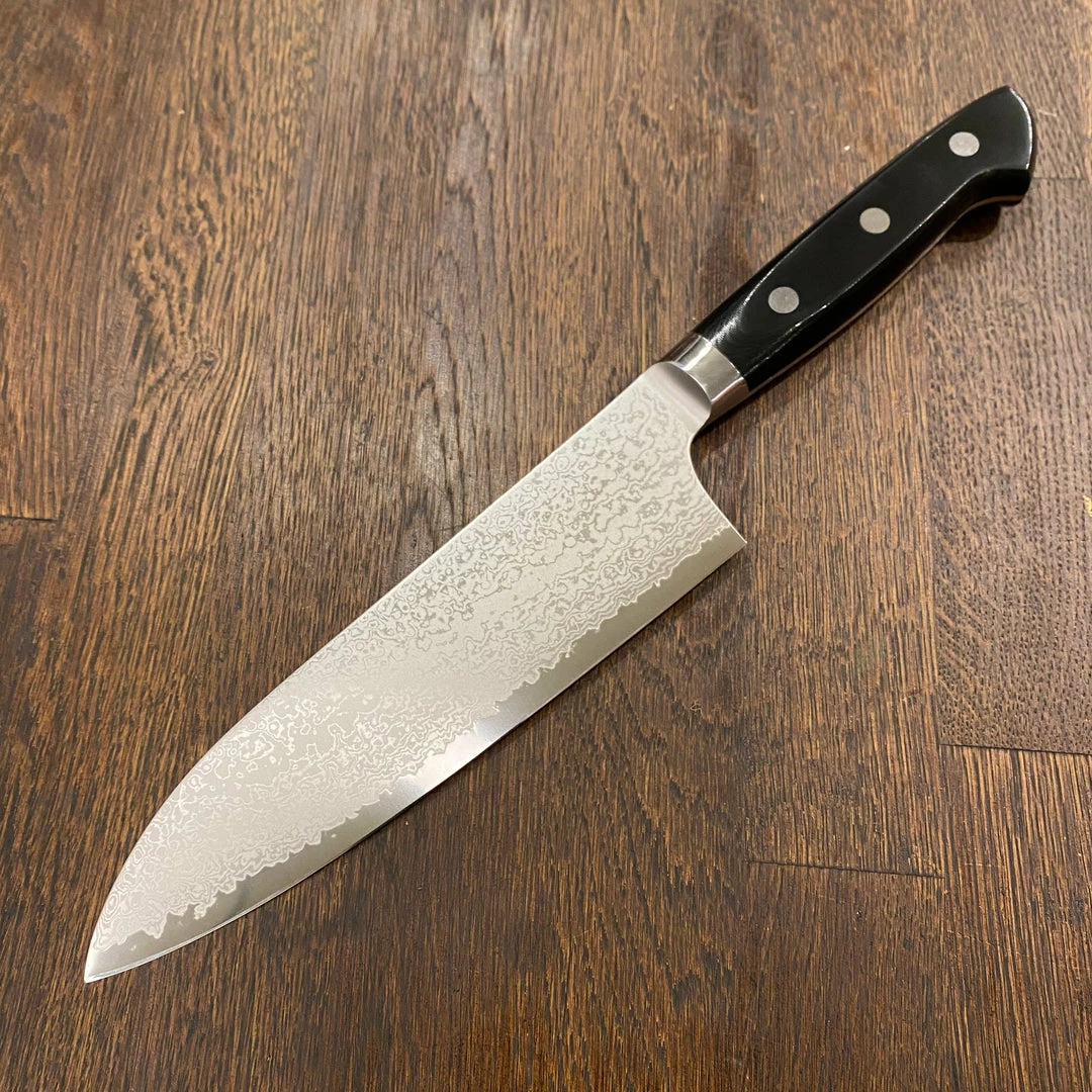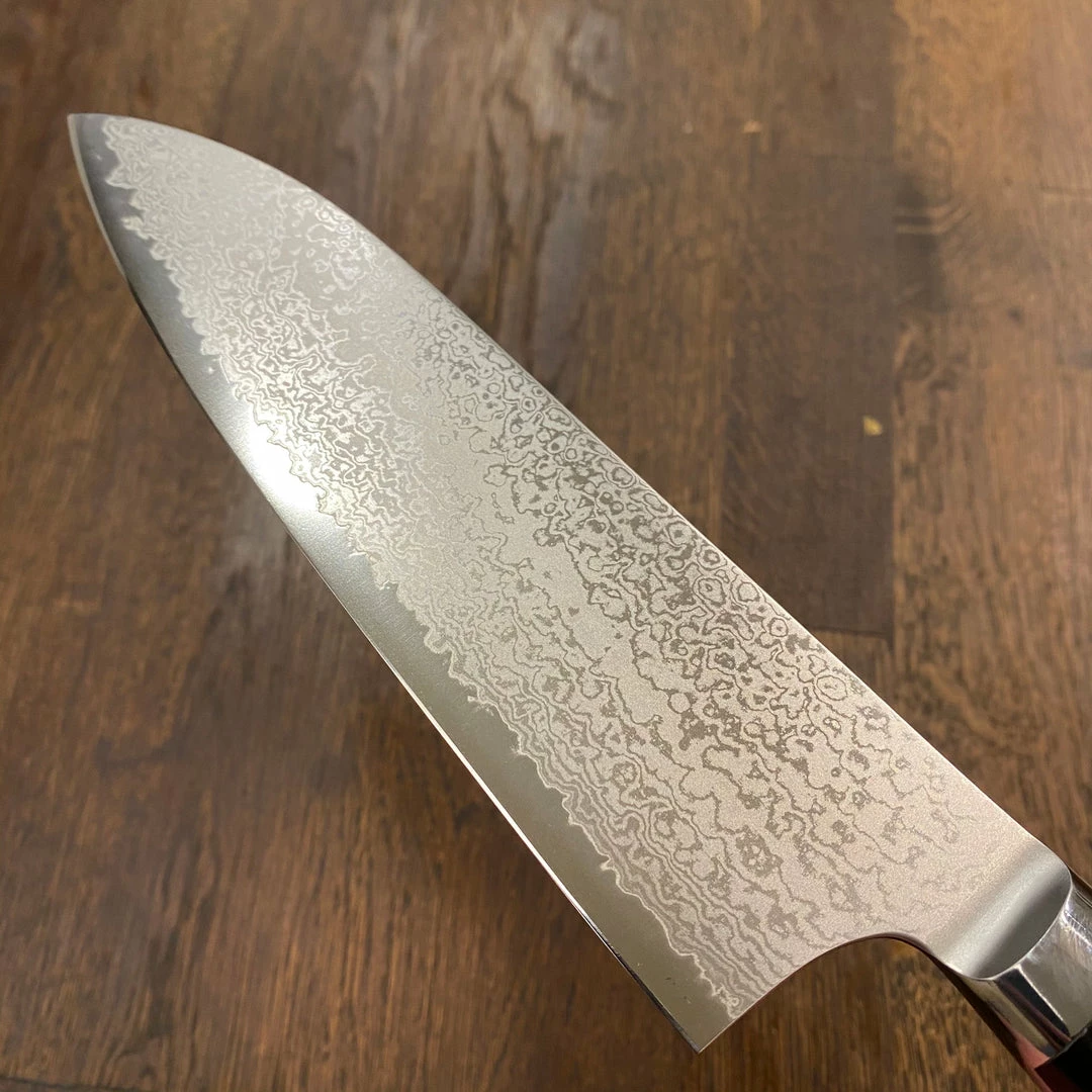 Stainless suminagashi clad VG10 stainless steel with linen micarta handle. Nice finish grinding with convex faced blades, polished spine and heelsย with aย attentive finish to the handles.