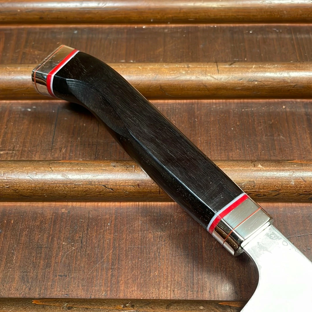Stainless suminagashi clad VG10 stainless steel with linen micarta handle. Nice finish grinding with convex faced blades, polished spine and heelsย with aย attentive finish to the handles.