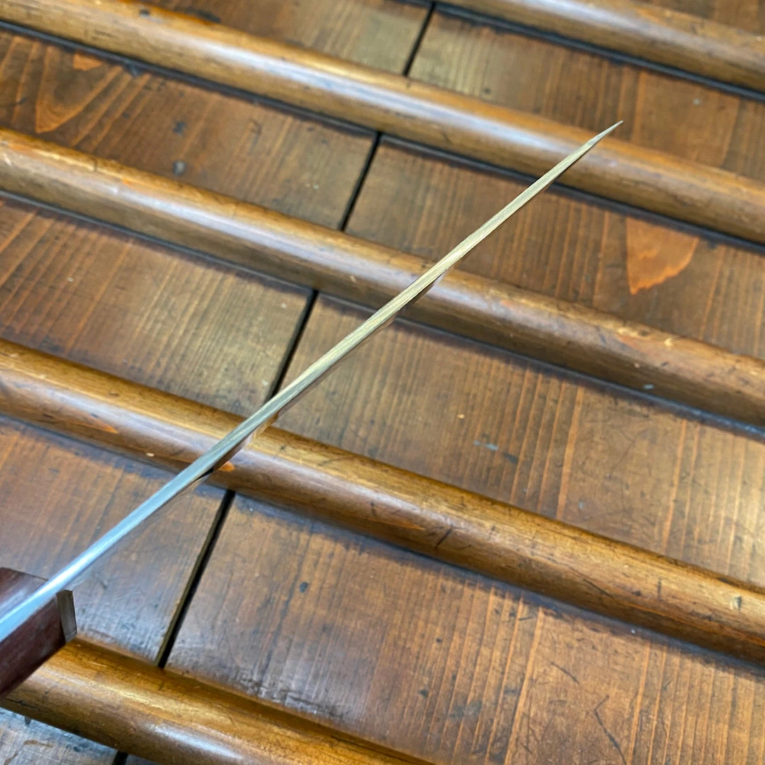 ย Kanehide semi stainless steel honesuki maru butchers knife made in Seki City Japan for the Japanese food service industry. A good no-frills workhorse made from good quality materials. The steel used in these is tempered to about 60/61 HRC and has excellent toughness and edge life.
